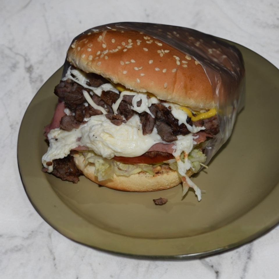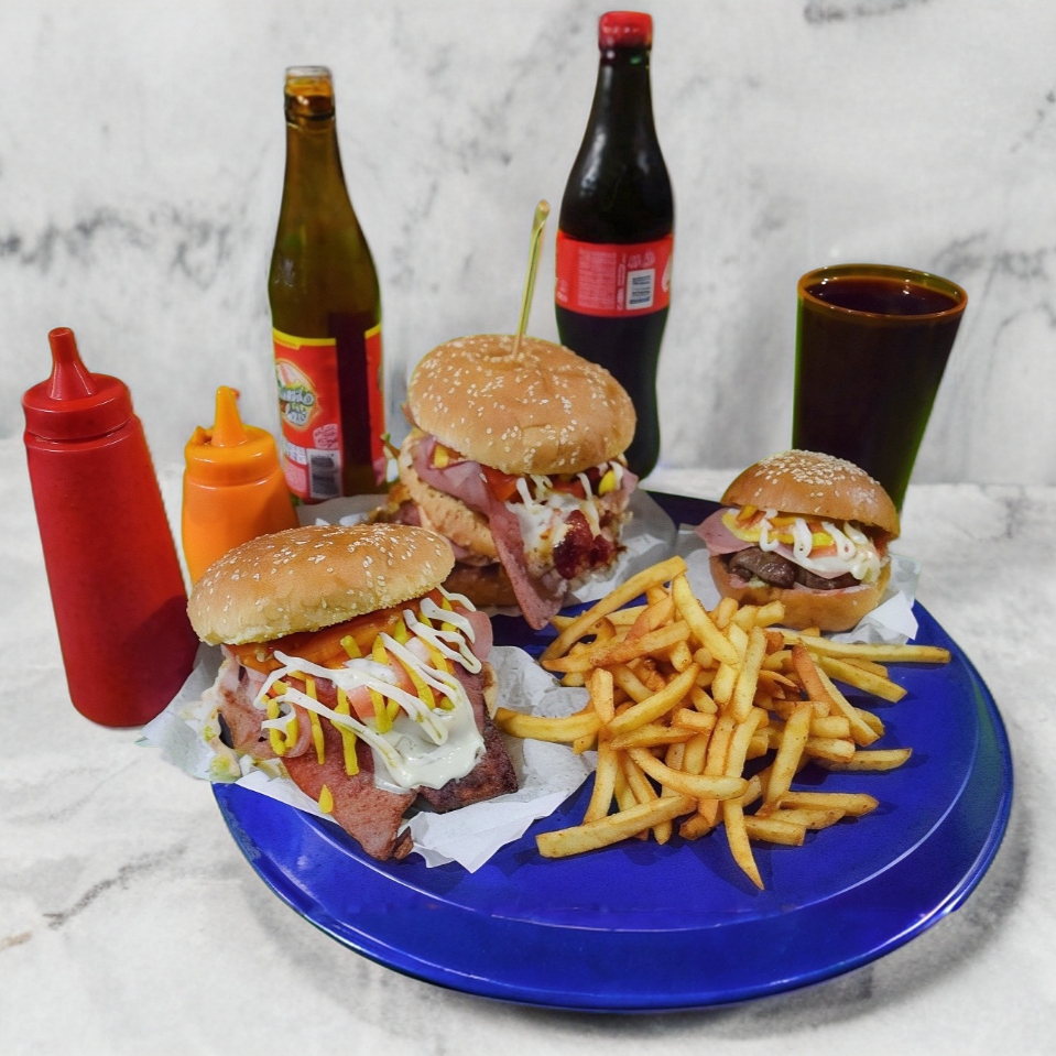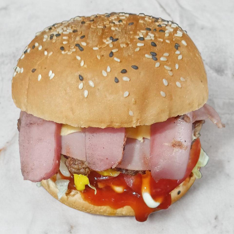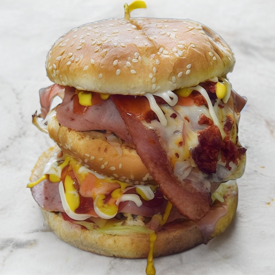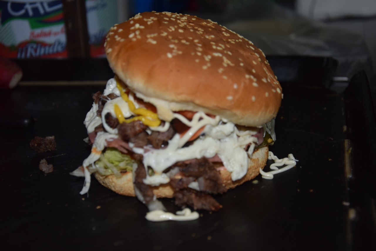Hamburguesa con aderezo, lechuga, tomate, picante, queso amarillo, jamon, queso manchego, chorizo, salchicha, tocino y 2 carnes de doble grosor.