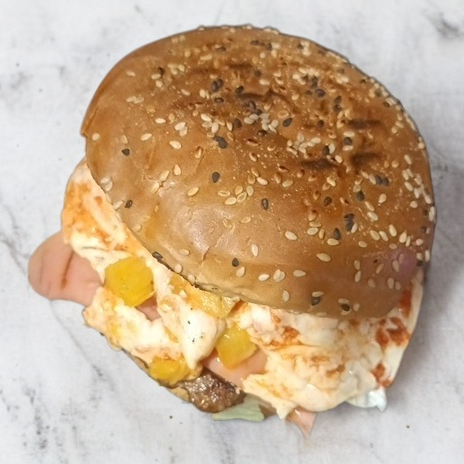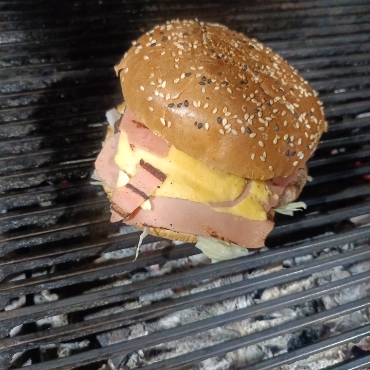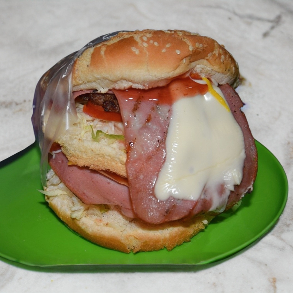 Hamburguesa con aderezo, lechuga, tomate, picante, queso amarillo, jamon, piña, queso manchego, tocino y 2 carne.