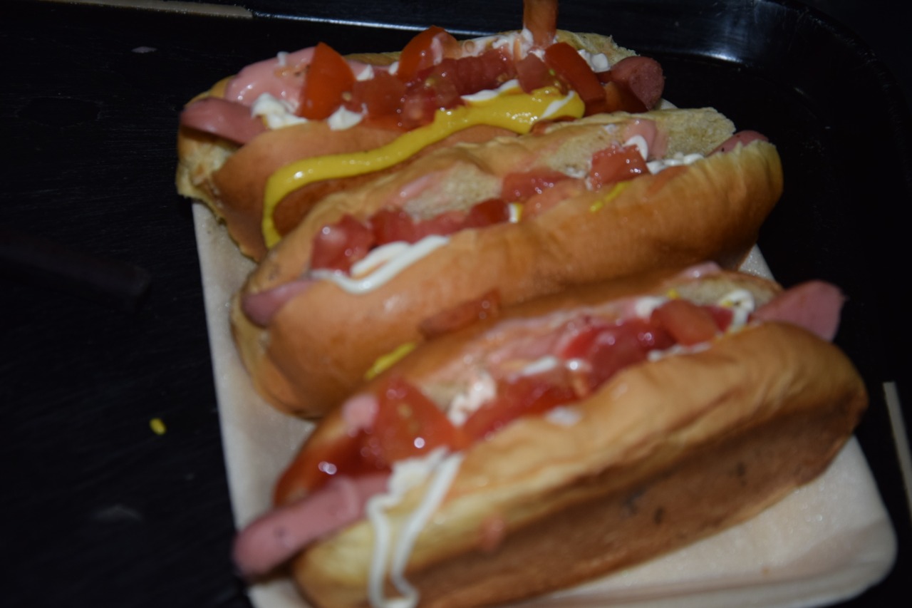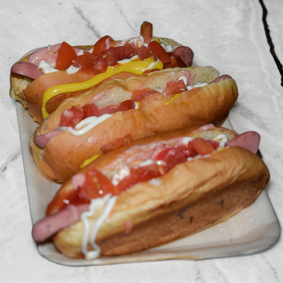 pan artesanal, adereso, lechuga, tomate, salchicha, y picante