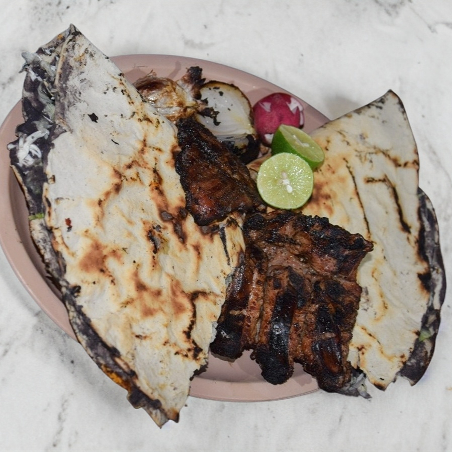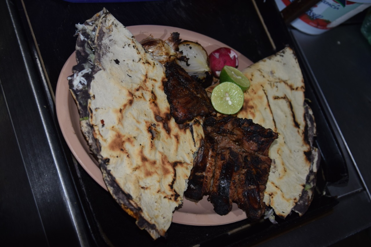 aciento, frijol, lechuga, tomate, quesillo y costilla Incluye chile de agua, cebollitas, rabano, limon, salsa y gucamole sin costo extra