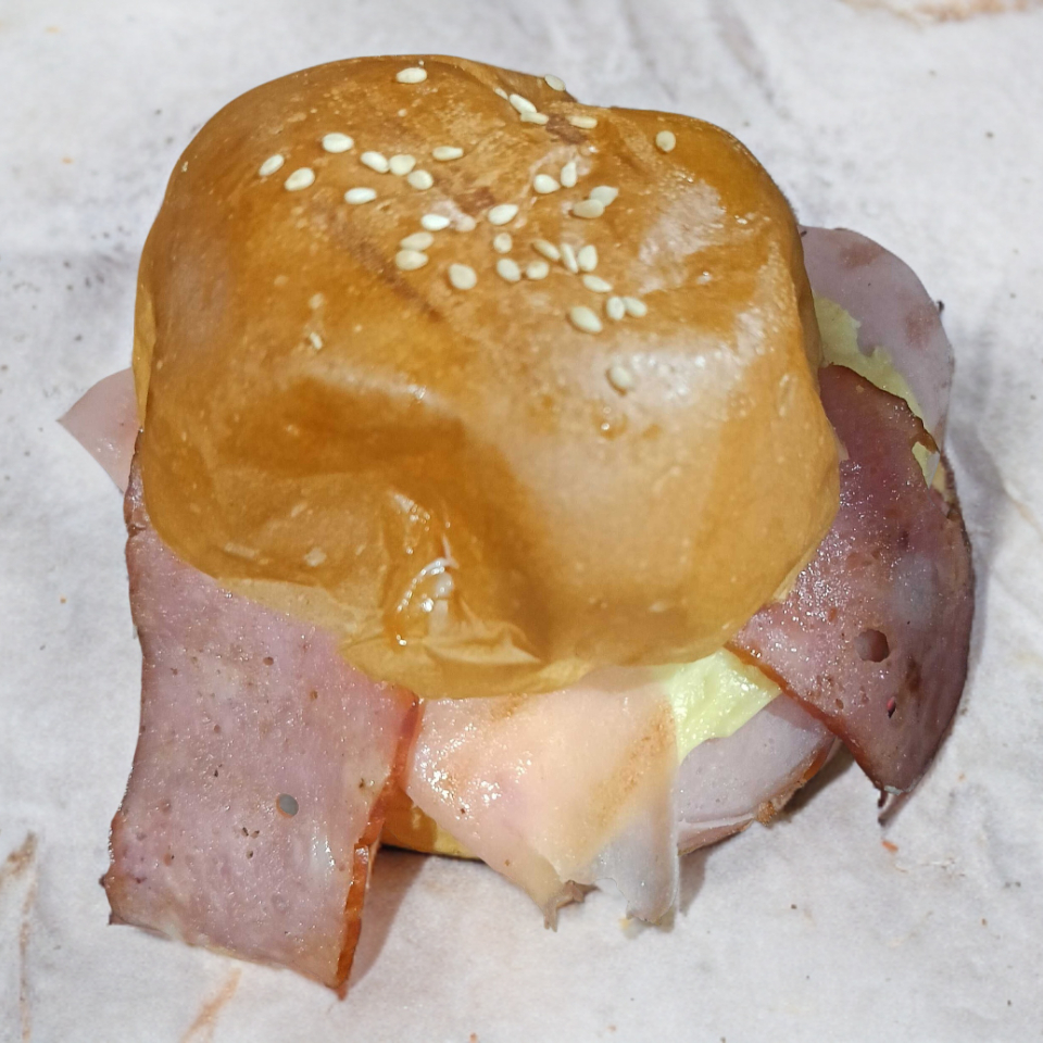 Pan artesanal ,Hamburguesa tamaño pequeño con aderezo, lechuga, tomate, picante, queso amarillo, jamon, queso manchego, y 1 carne de res pequeña , sobre de catsup