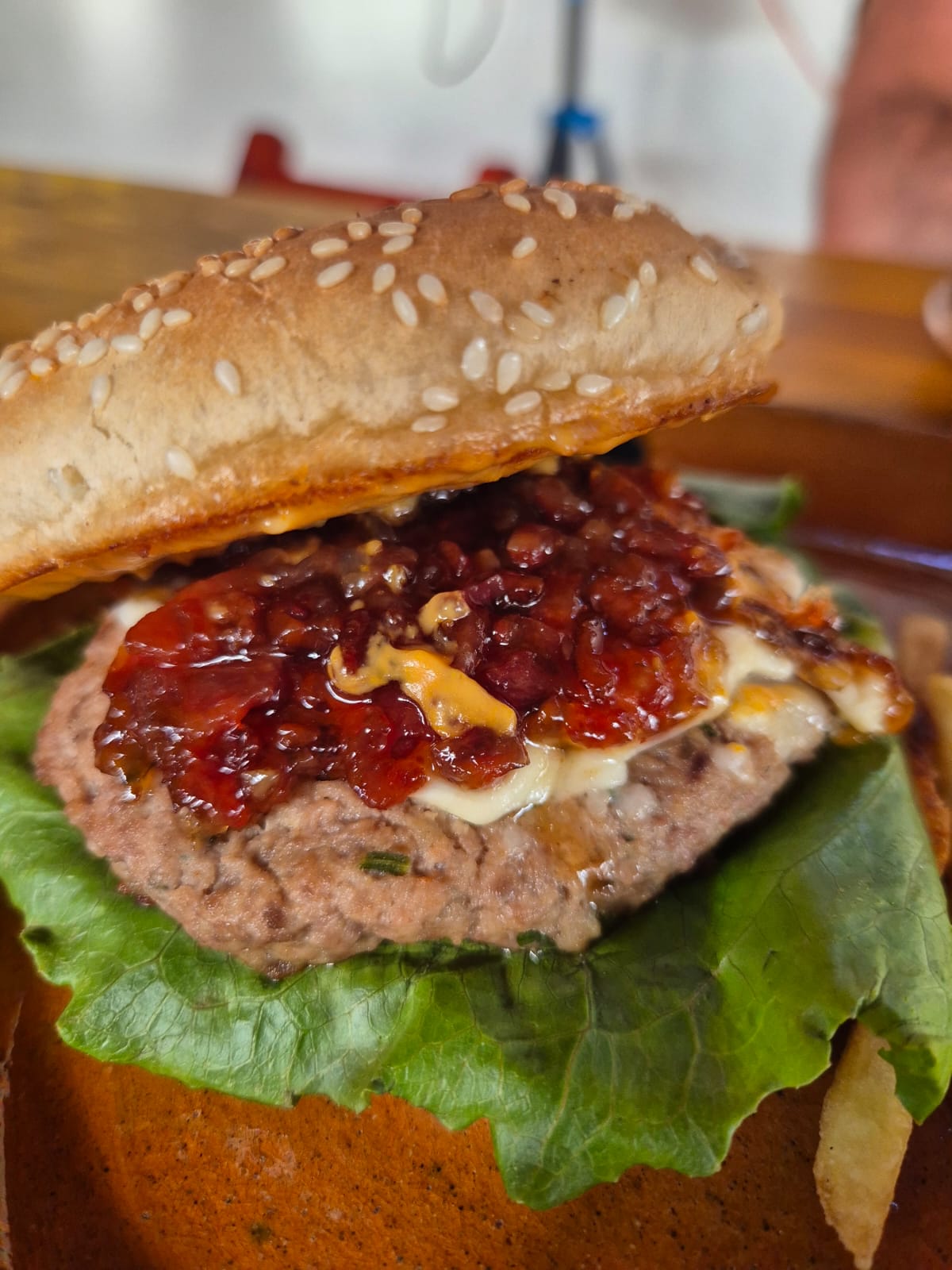 Pan llenador con carne de casa, tocino, lechuga y tomate.