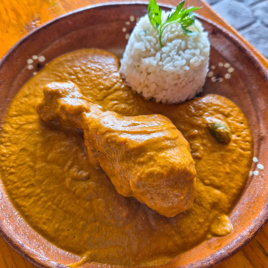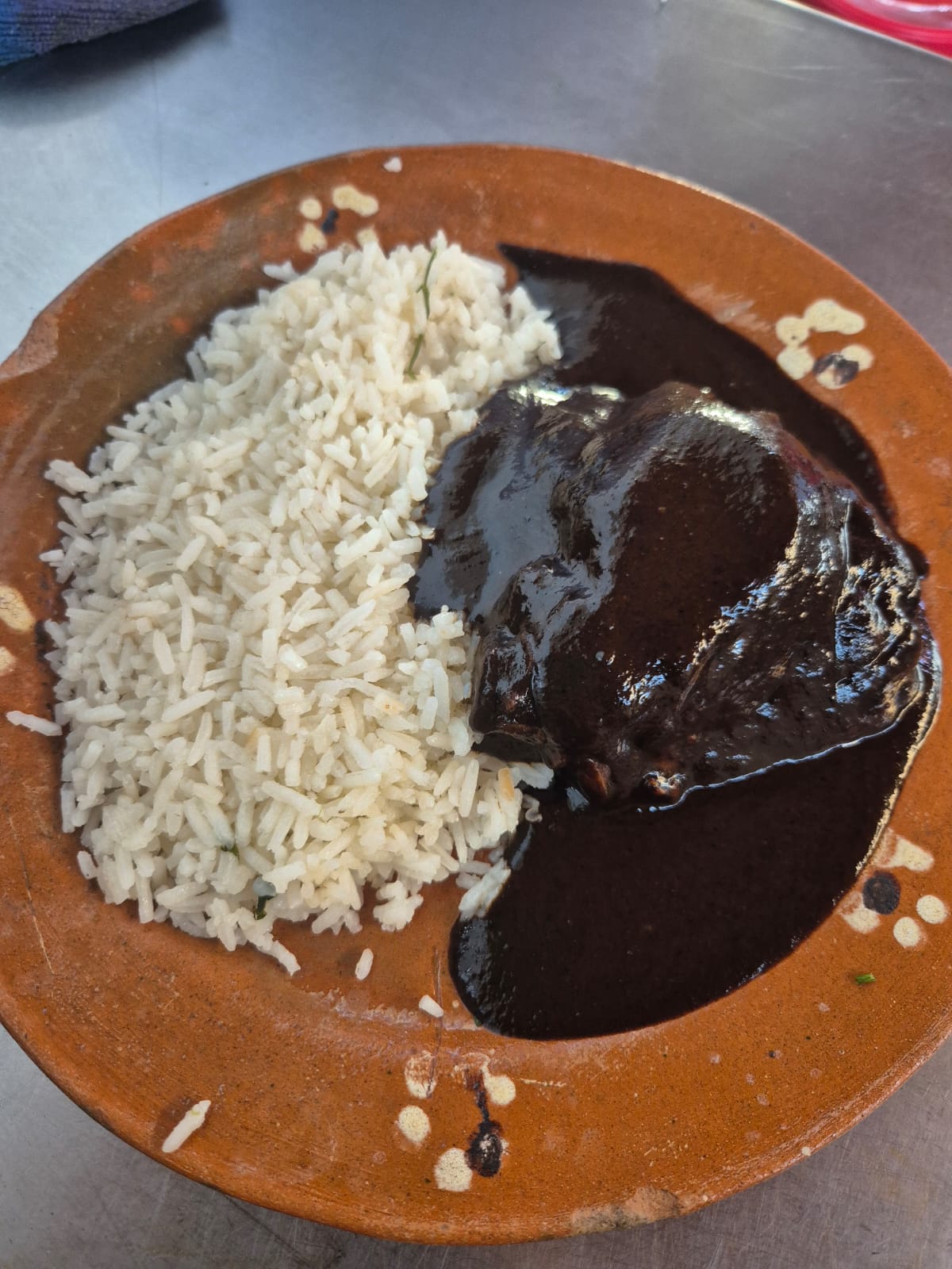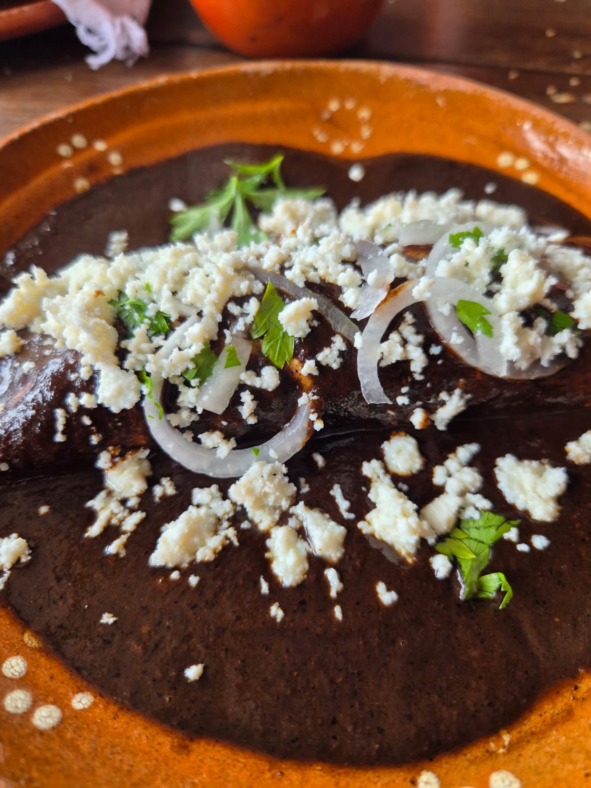 Rellenas de pollo, bañadas en mole, espolvoreadas con queso fresco, cebolla y perejil.