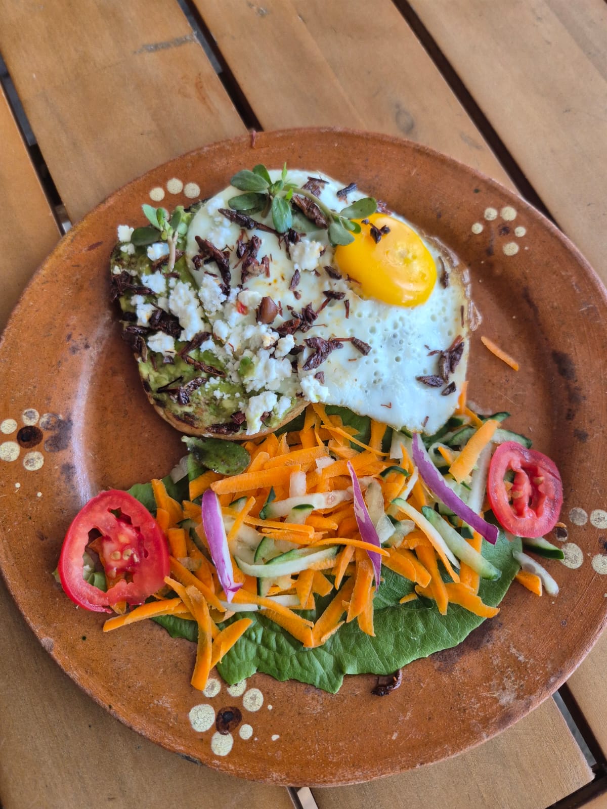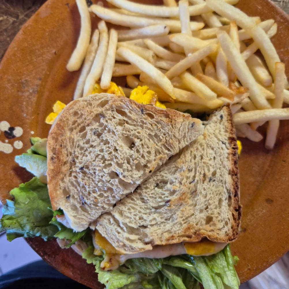 Pan de masa madre relleno de huevo con mix de queso, lechuga, tomate y aguacate, acompañado de papas o ensalada.