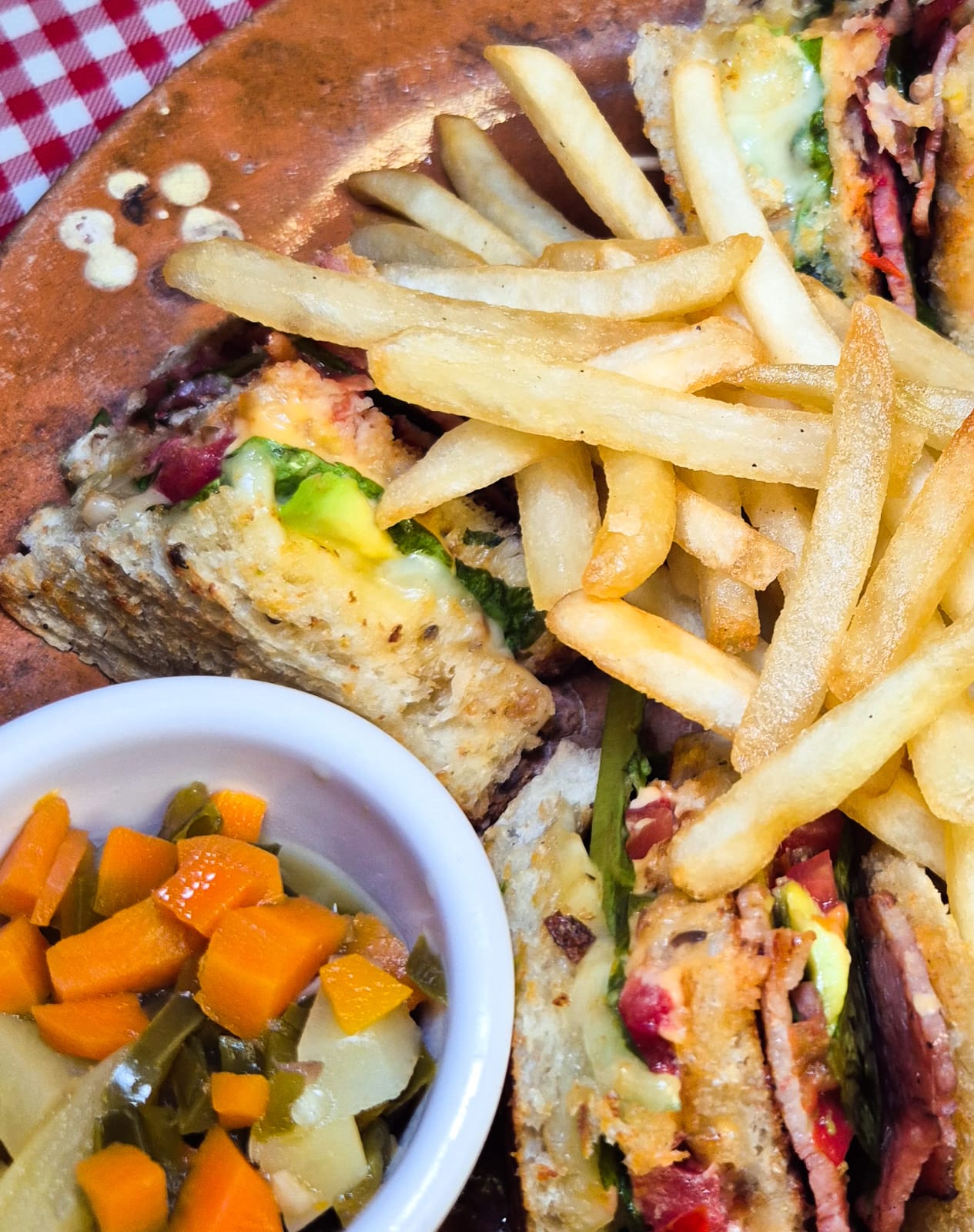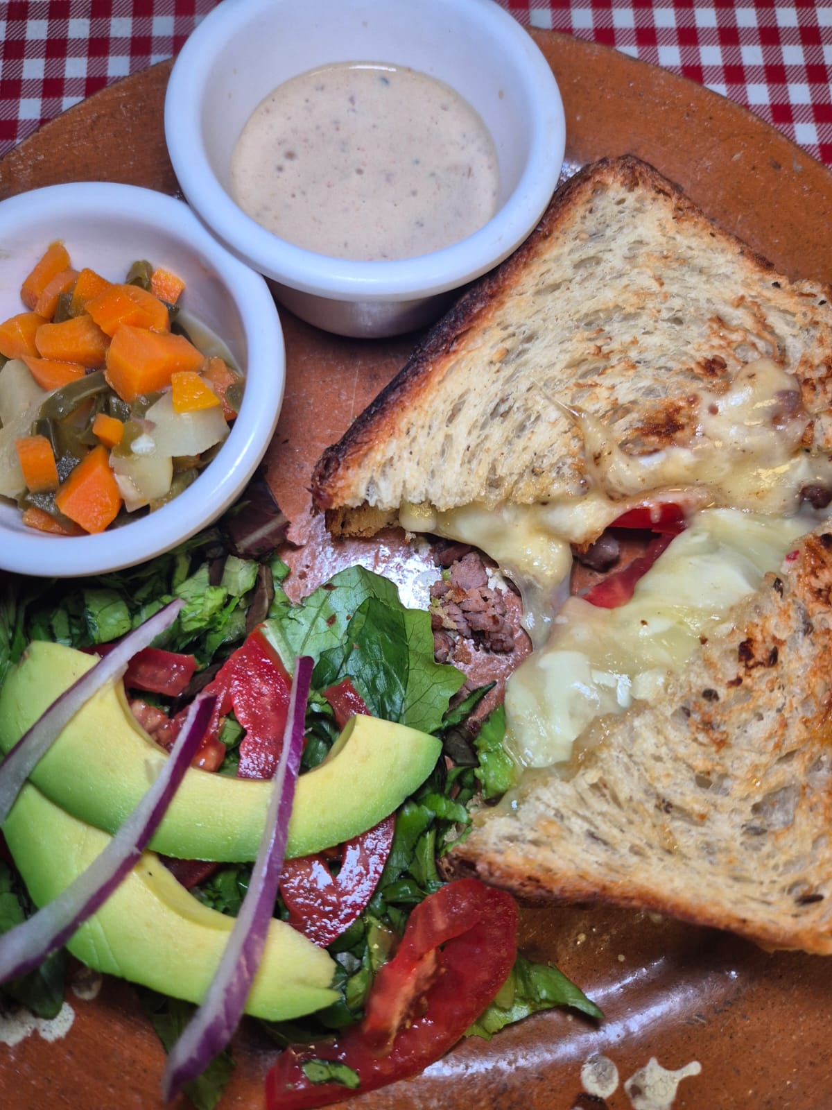 Pan de masa madre relleno de arrachera con quesos, lechuga, tomate y aguacate, acompañado de papas o ensalada.