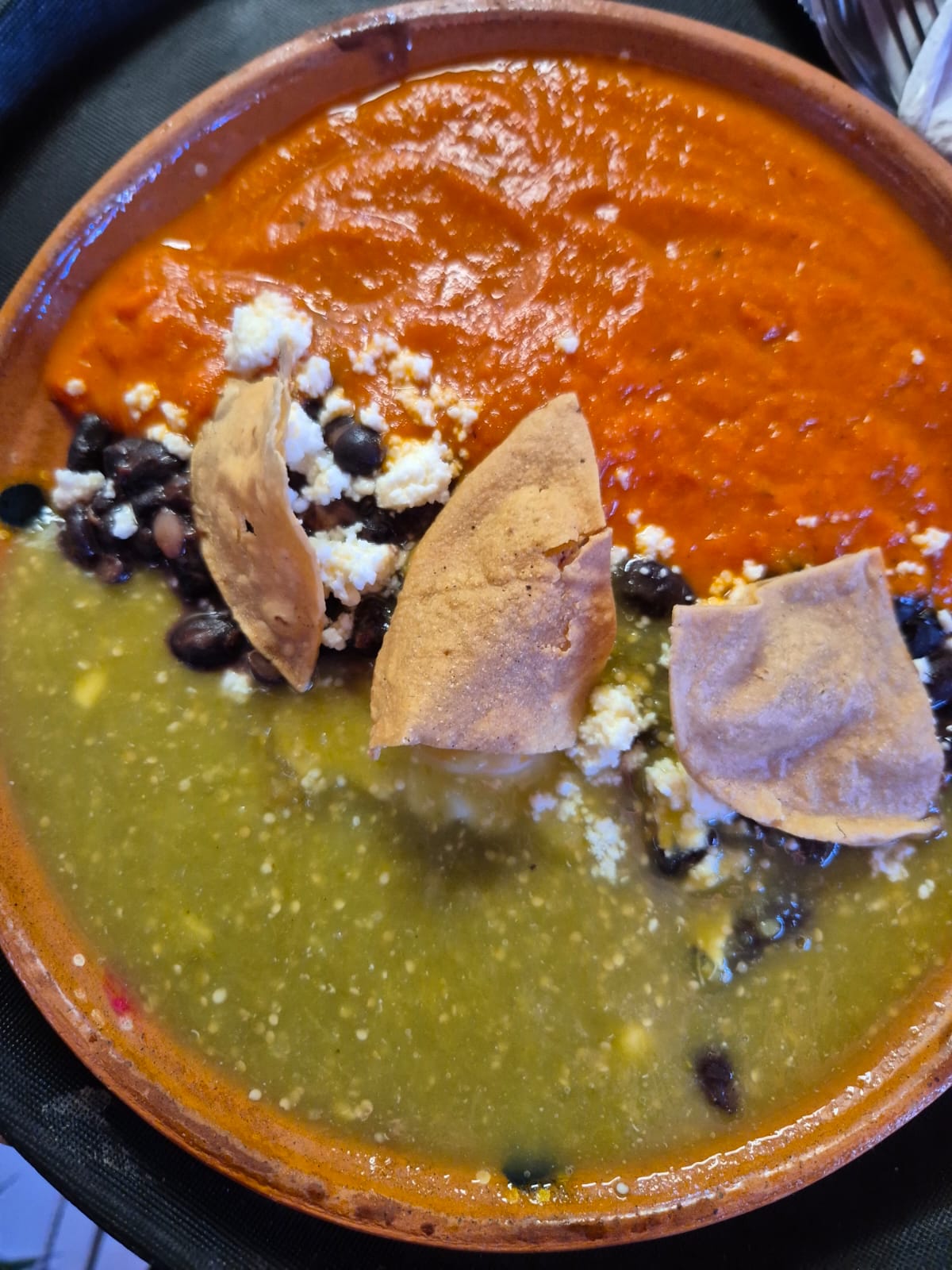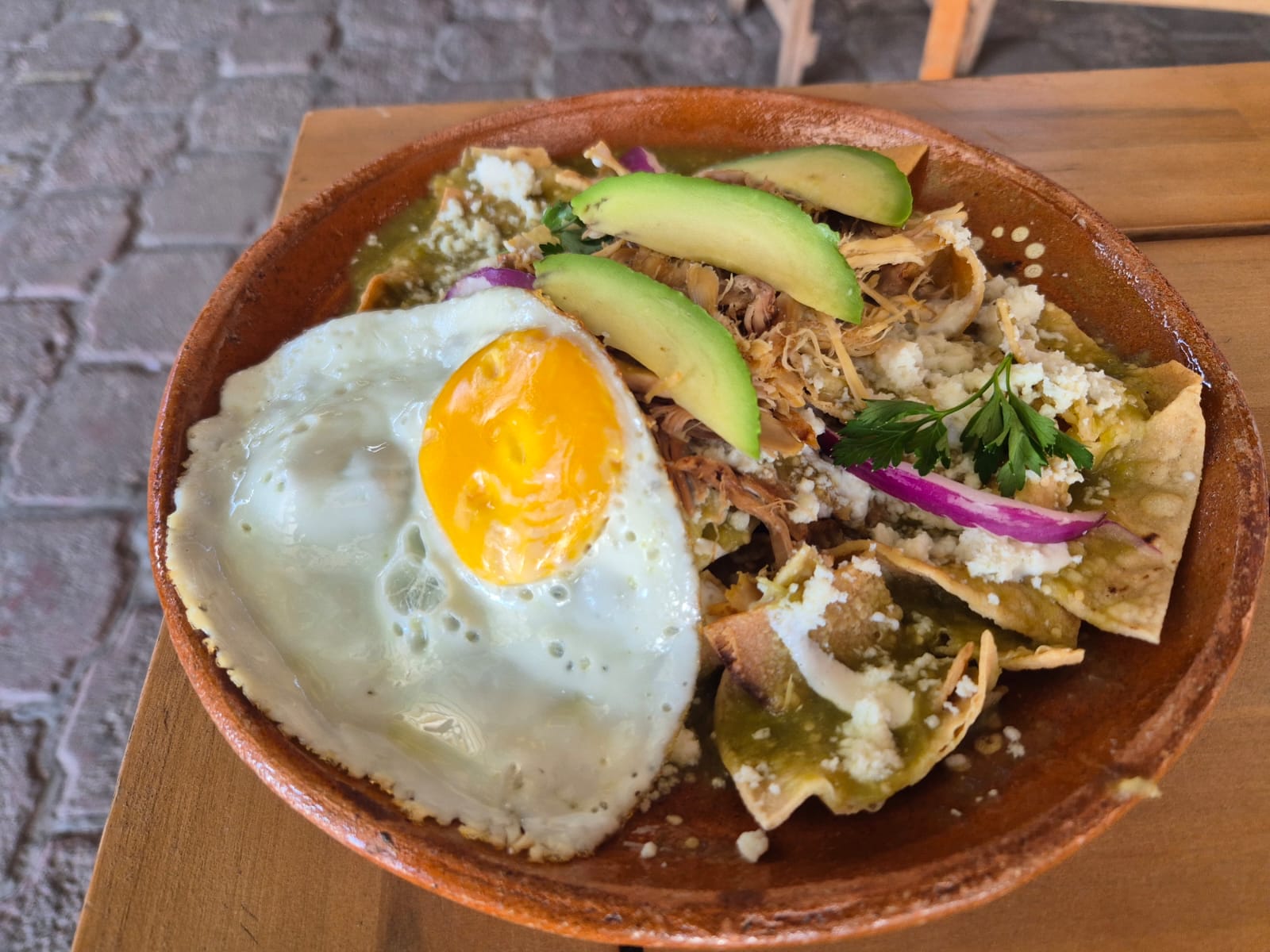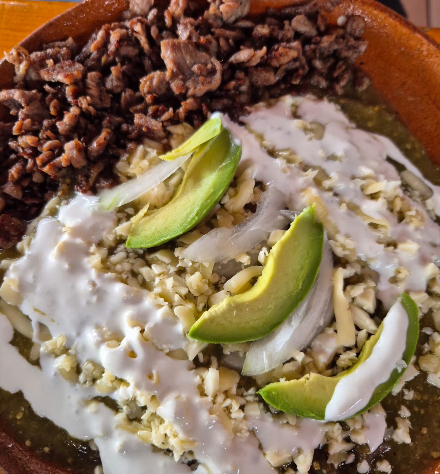 Totopos bañados en salsa verde o roja con pollo, espolvoreados con queso fresco, cebolla y perejil, acompañados de frijoles de la casa.