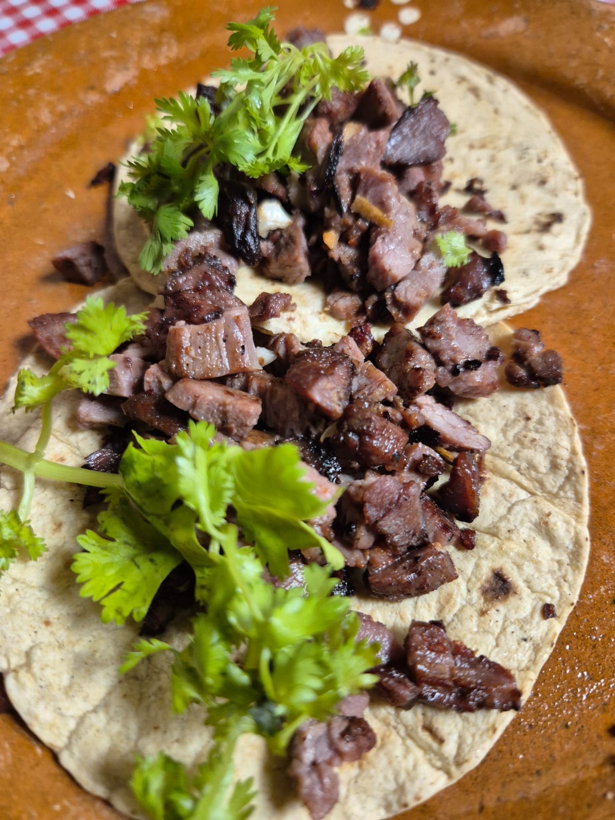 2 De arrachera y 2 de chistorra, con chicharrón.