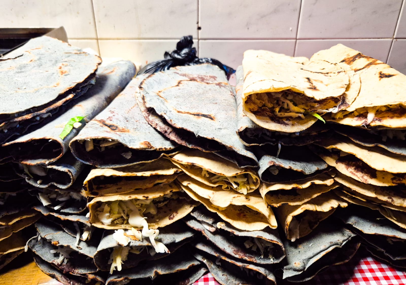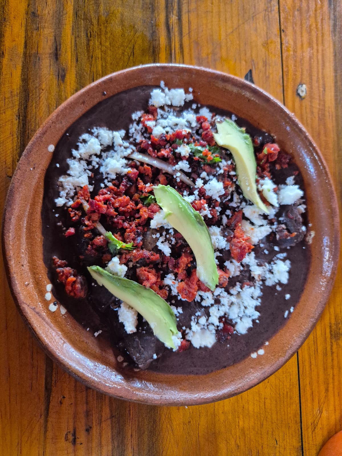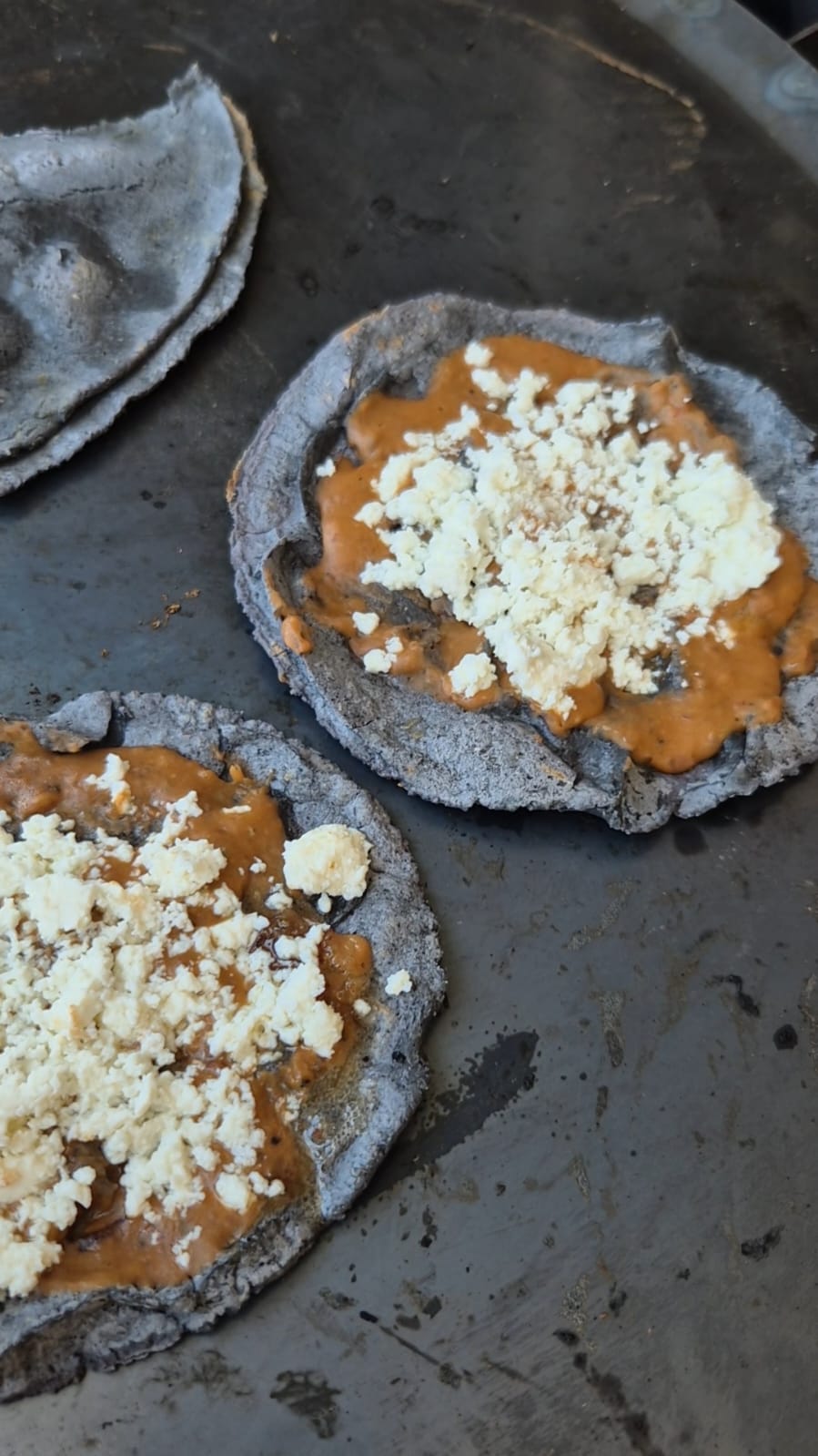 Rellenas de quesos, bañadas en salsa de frijol con chistorra, espolvoreadas con queso fresco, decoradas con cebolla, cilantro y crema.