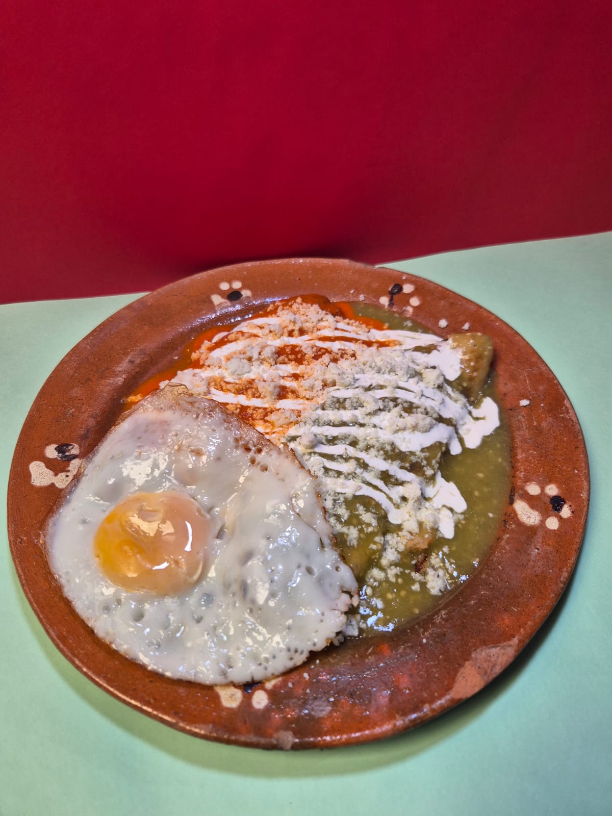 (Tortilla rellena de quesos, bañada en salsa verde o roja, espolvoreada con queso fresco, cebolla, perejil, acompañada con frijol)