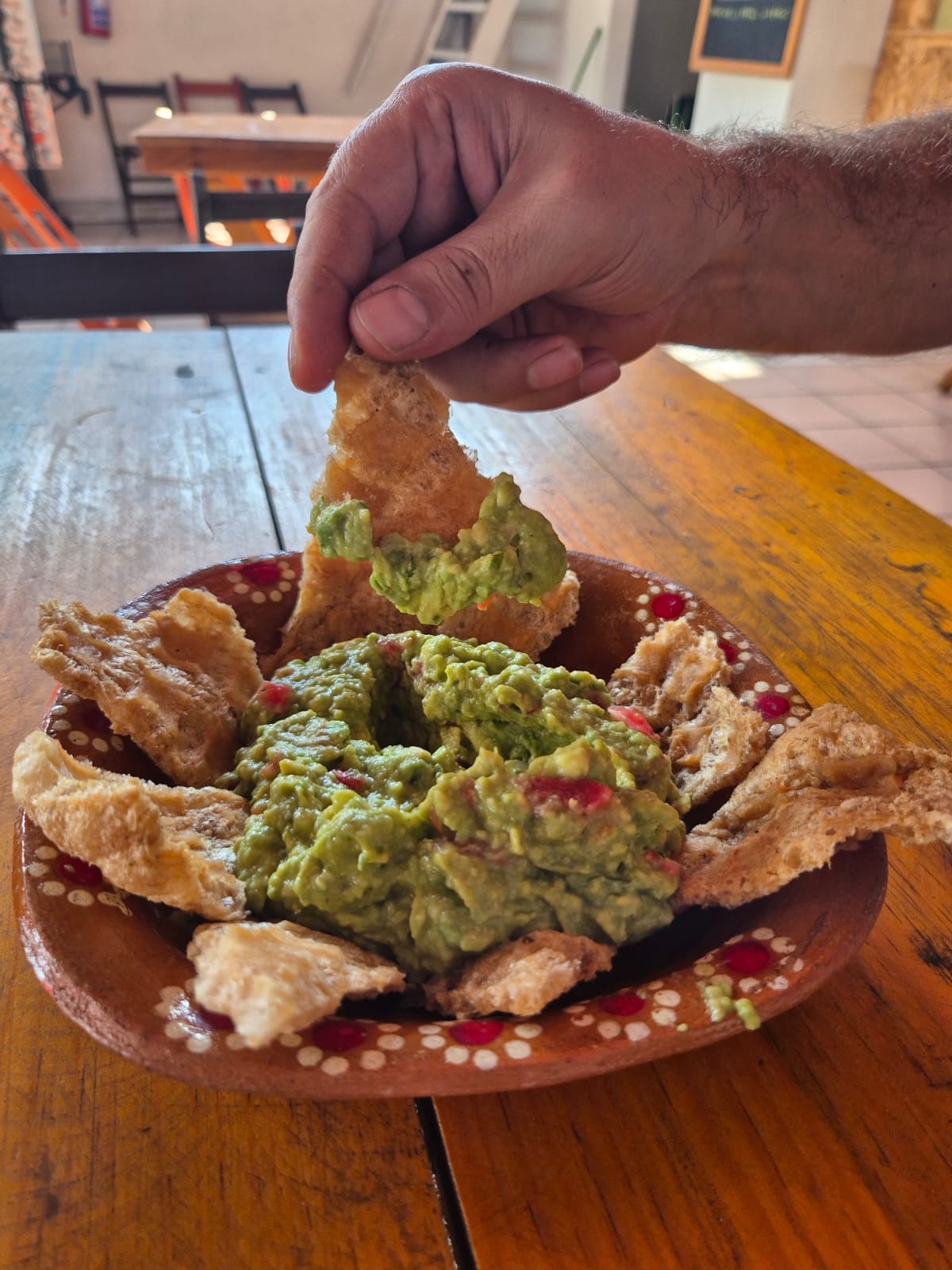 Machacado de aguacate con trozos de tomate, cebolla, cilantro, chile serrano, sal y limón, con chapulines.
