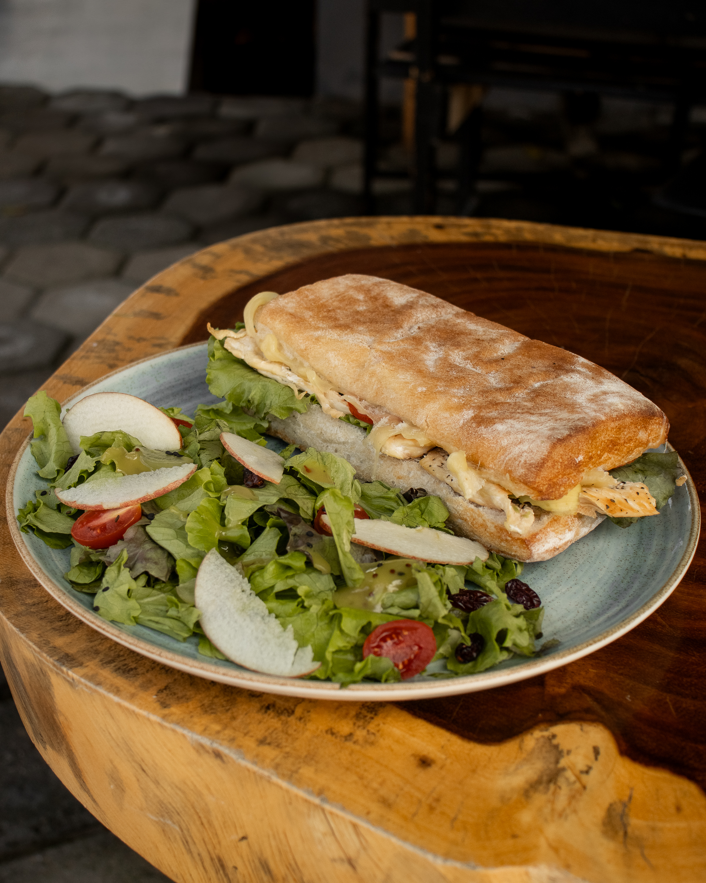 4 rebanadas de pan de masa madre, pollo, pechuga de pavo, tocino, queso gouda y aderezo a la alcachofa, acompañado de papas chip o ensalada.