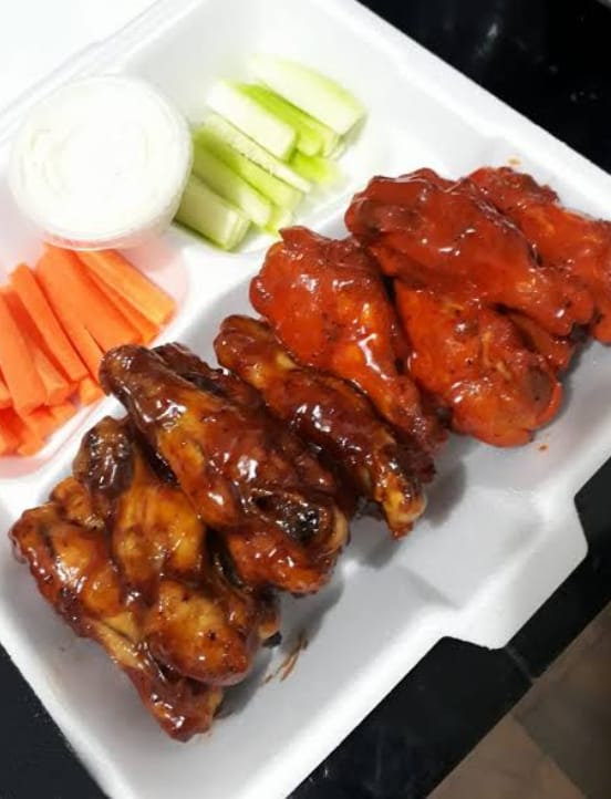 Alitas 10 piezas elige 2 de tus salsa favoritas (acompañadas de pepino y zanahoria )