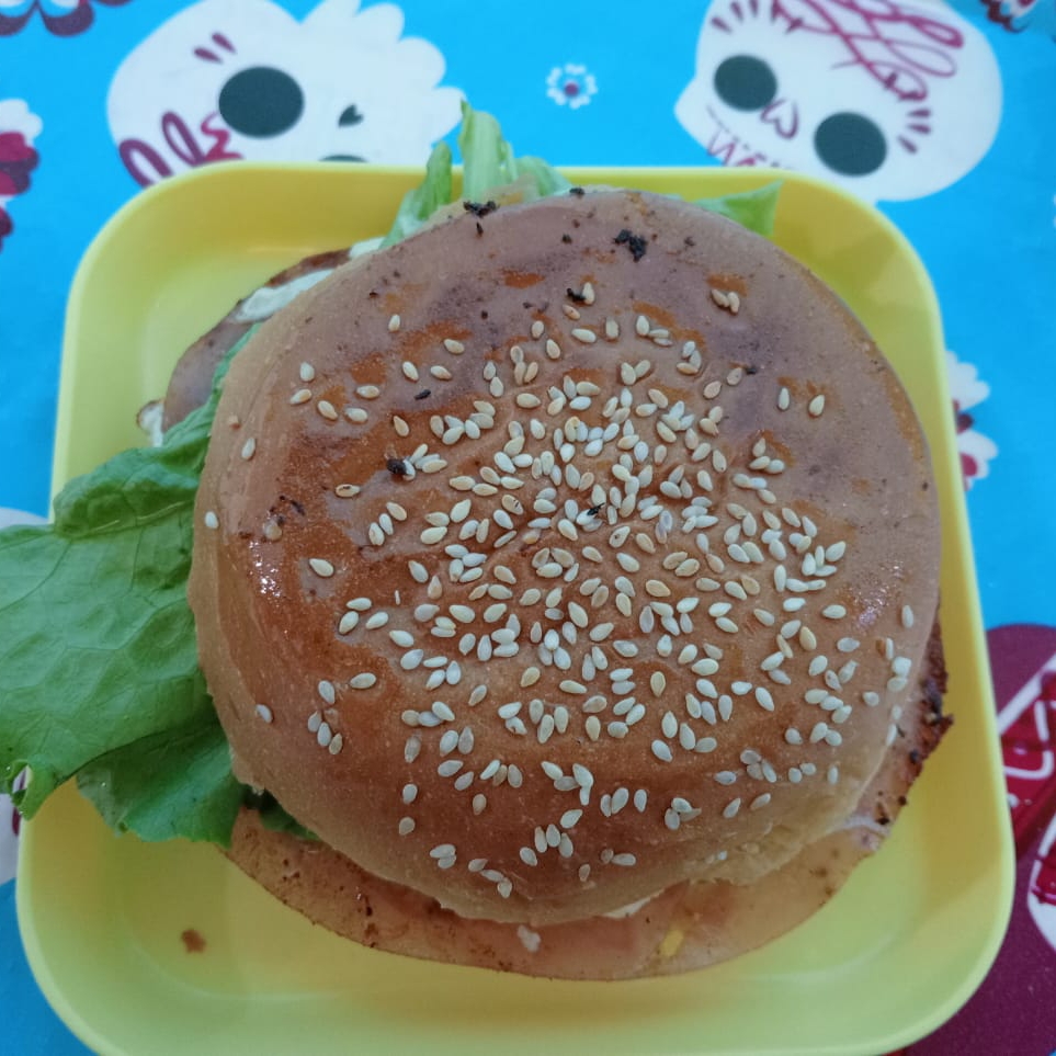 Pan, carne , lechuga, tomate , cebolla ,catsup ,mostaza, mayonesay queso amarillo