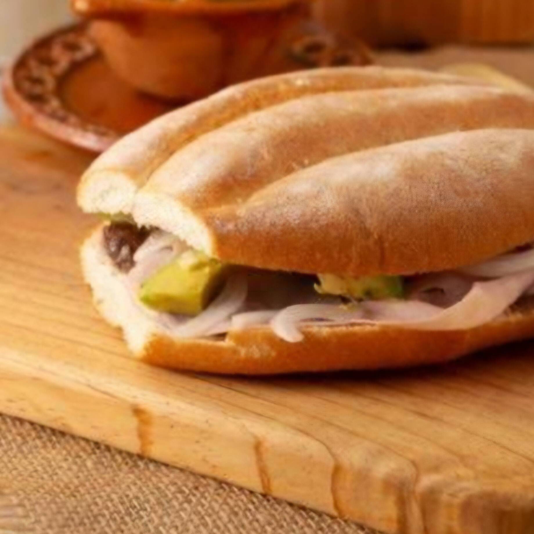 pan telera, mayonesa, frijol, chorizo, quesillo , lechuga, tomate, aguacate, chiles en vinagre