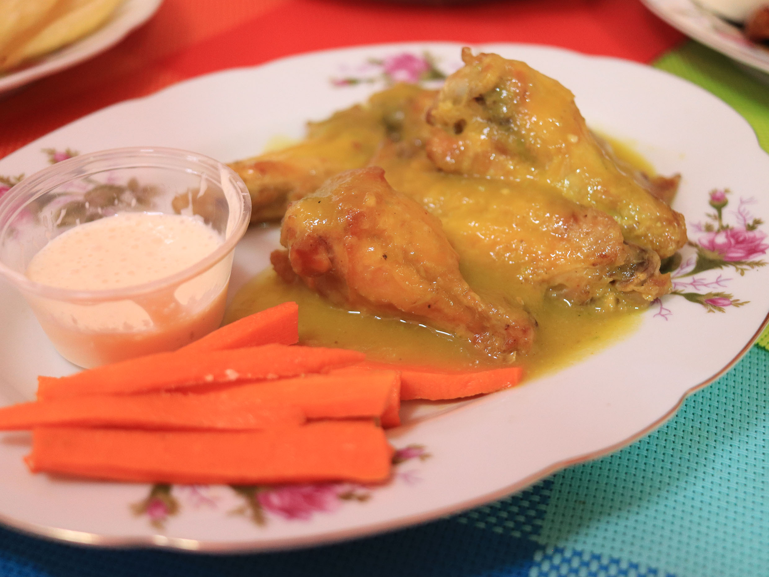 Alitas en salsa de pina casera con trocitos de jamon y pina con aderezo