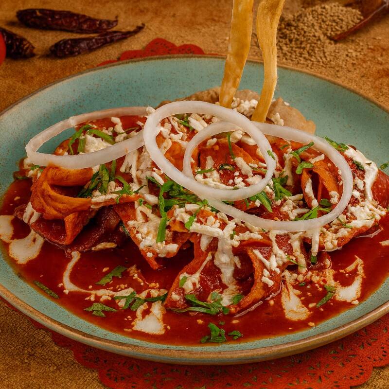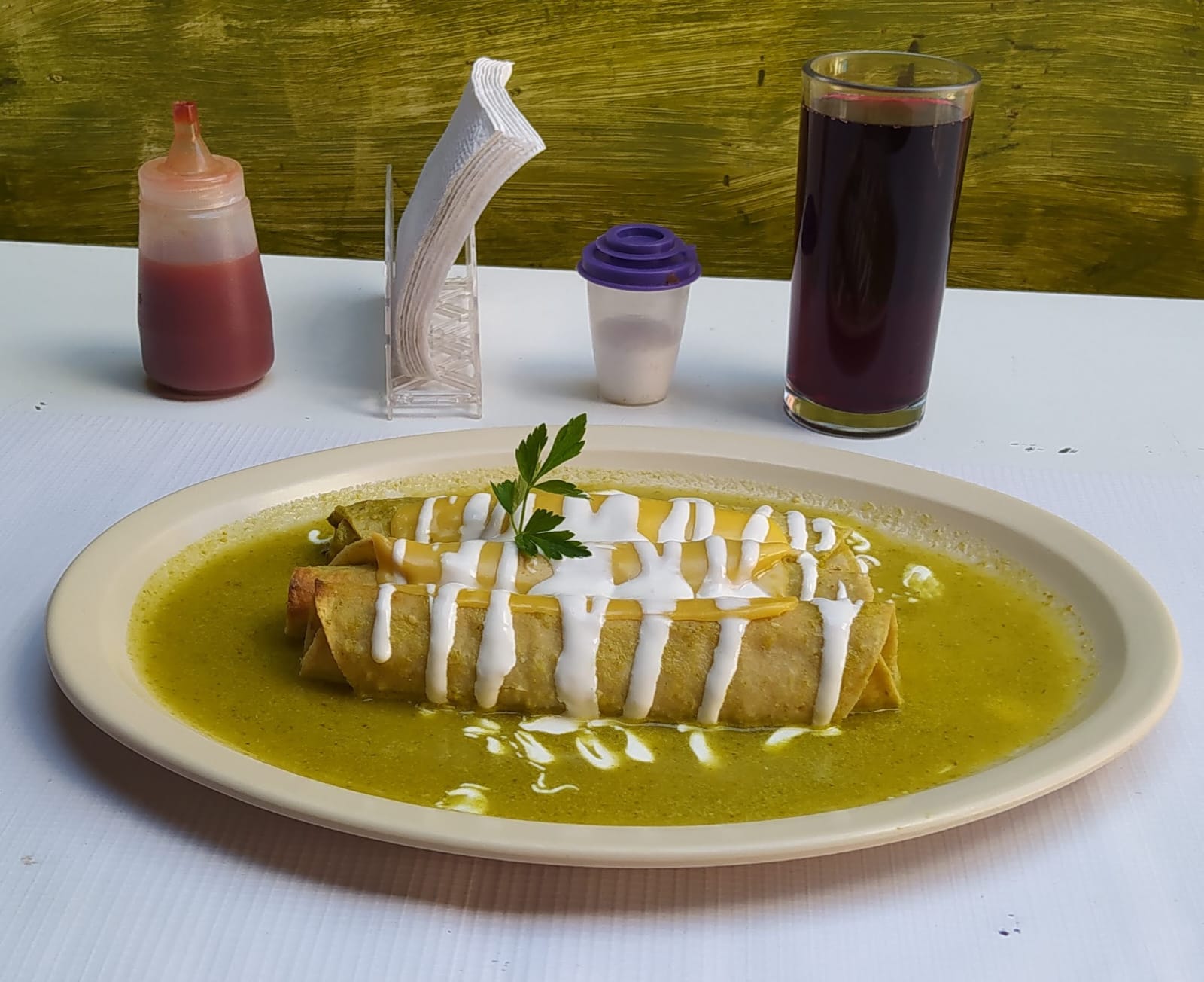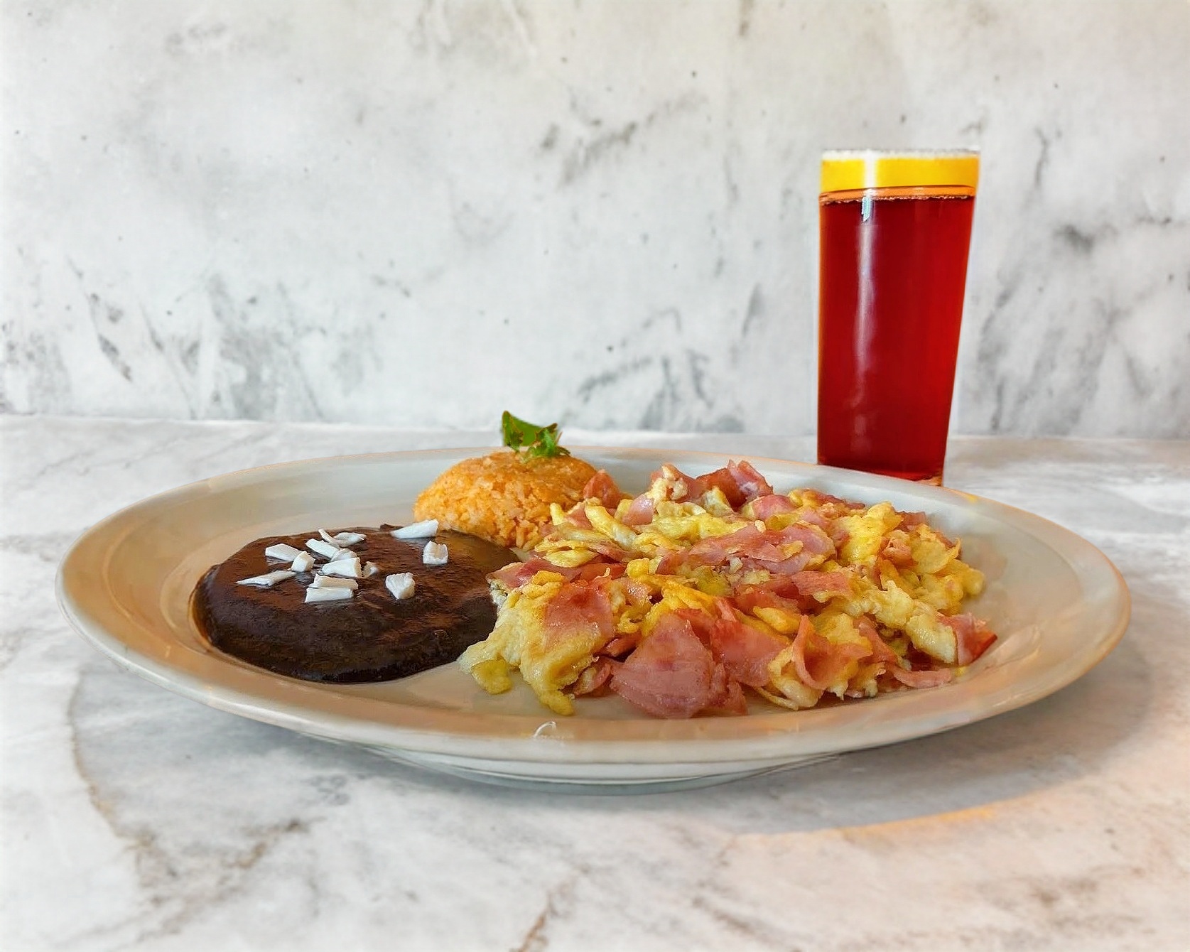 Con queso, crema y cebolla, incluye telera, café, pan dulce y salsa picante.