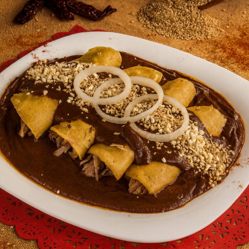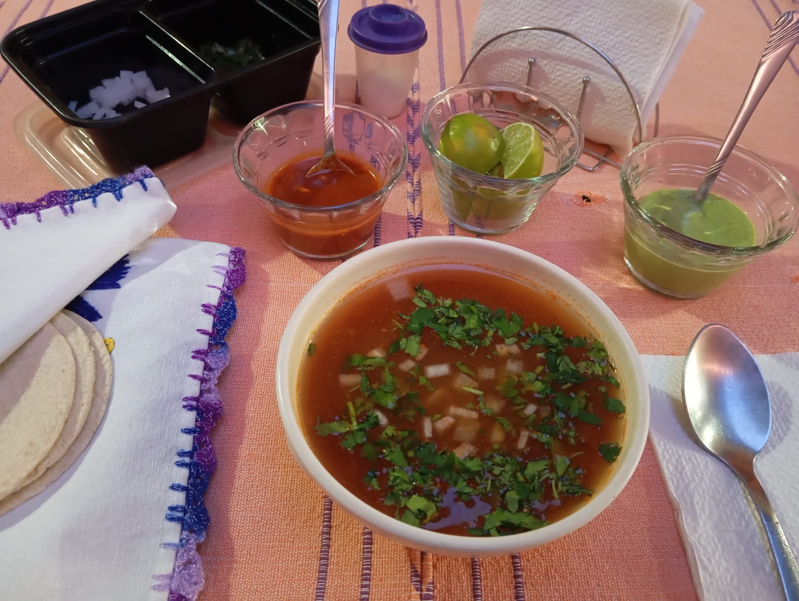 Con cebolla, cilantro, limón, guacamole, salsa picante y tortillas.