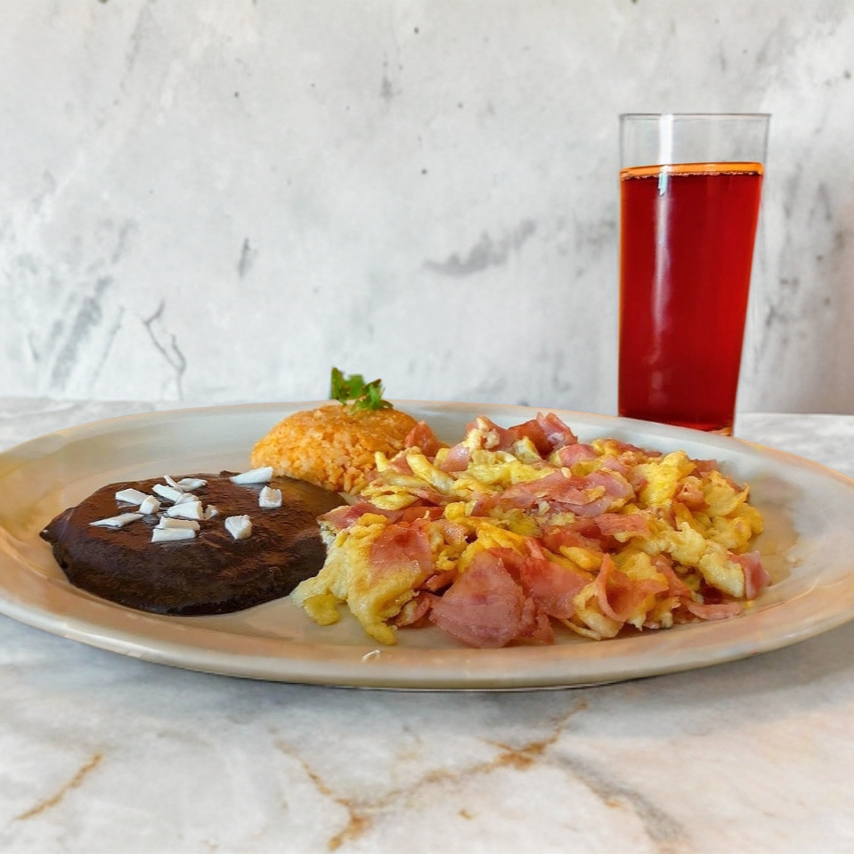 omelette, puedes elegir entre Jamon con quesillo o chorizo con quesollo servidos con 2 guarniciones, incluye tortillas, café de olla, pan dulce y salsa picante.