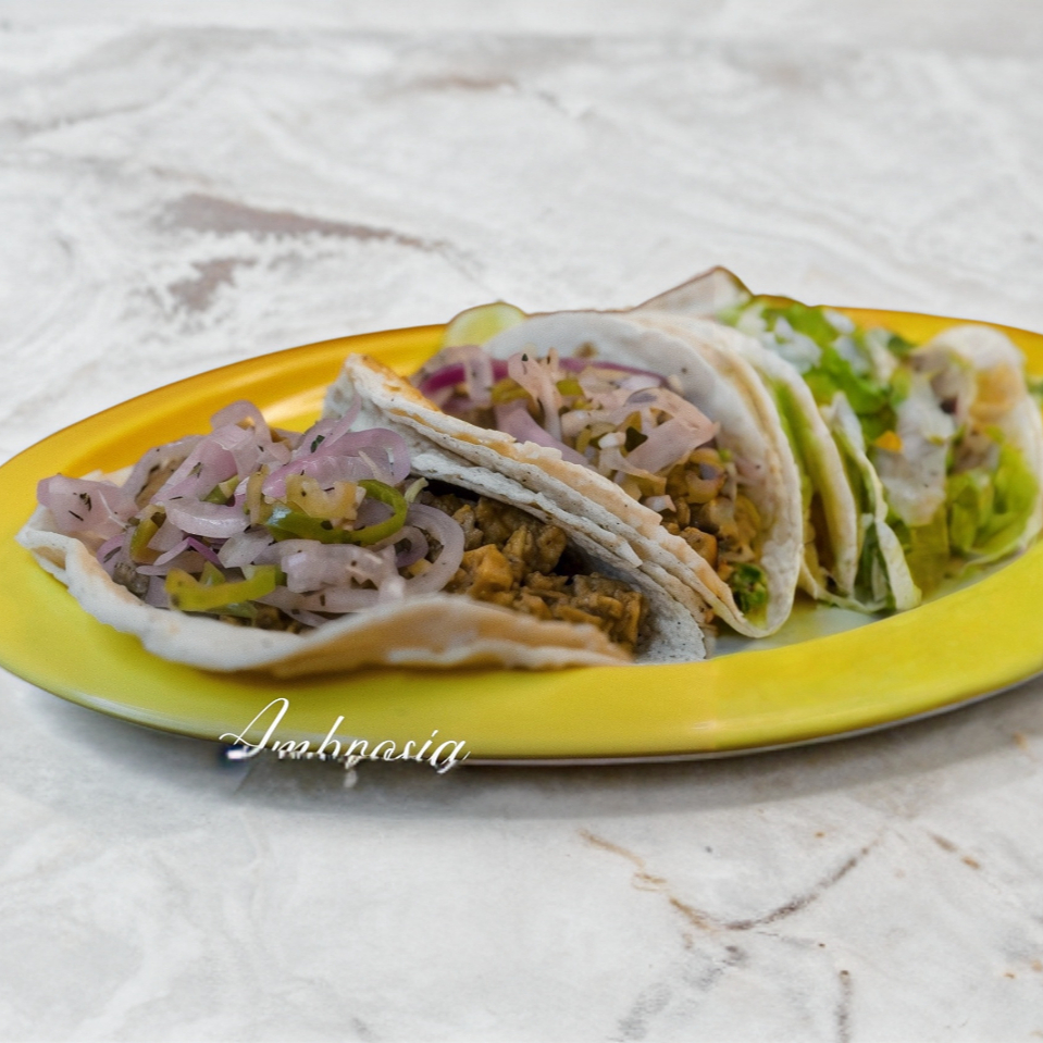 5 Tacos con cebolla, cilantro, limón, guacamole, salsa picante.