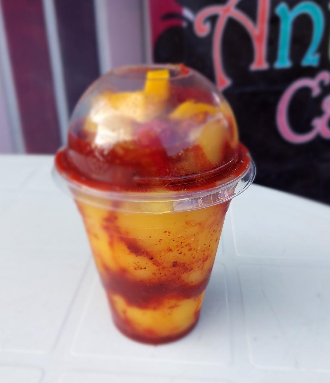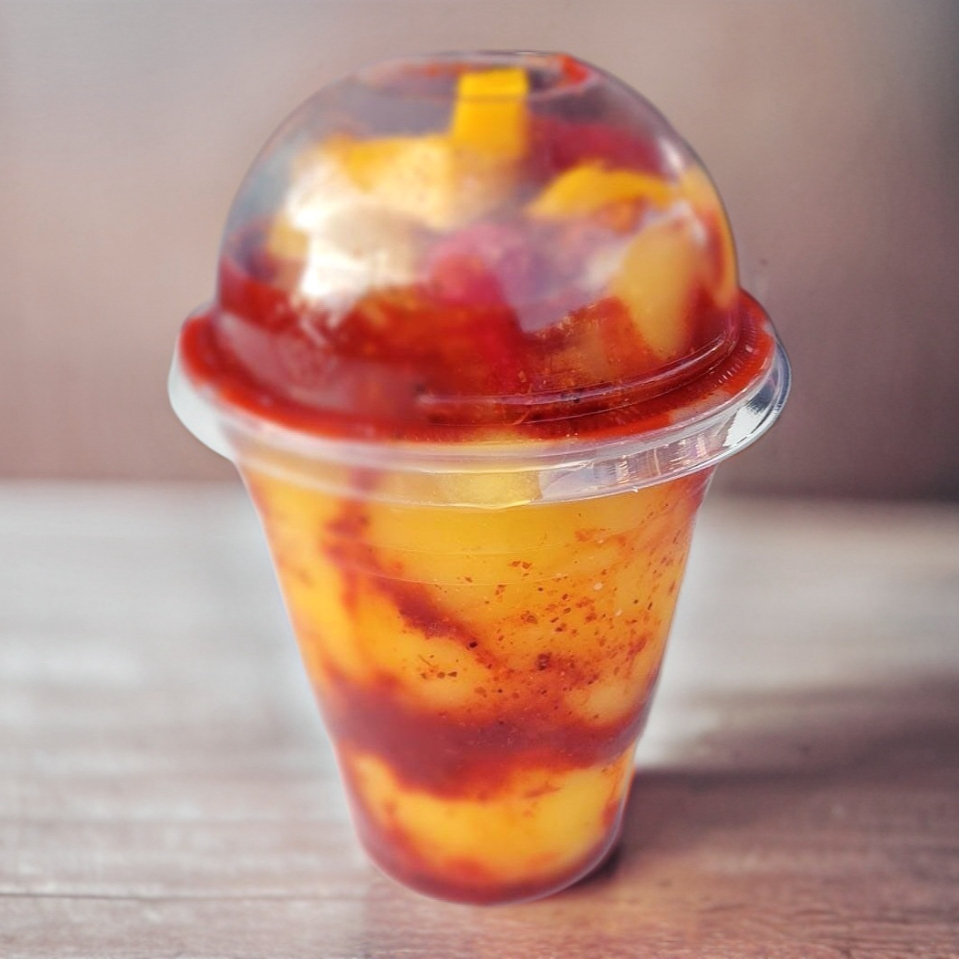 Granizado de mango, acompañado de chamoy y Chile tajin