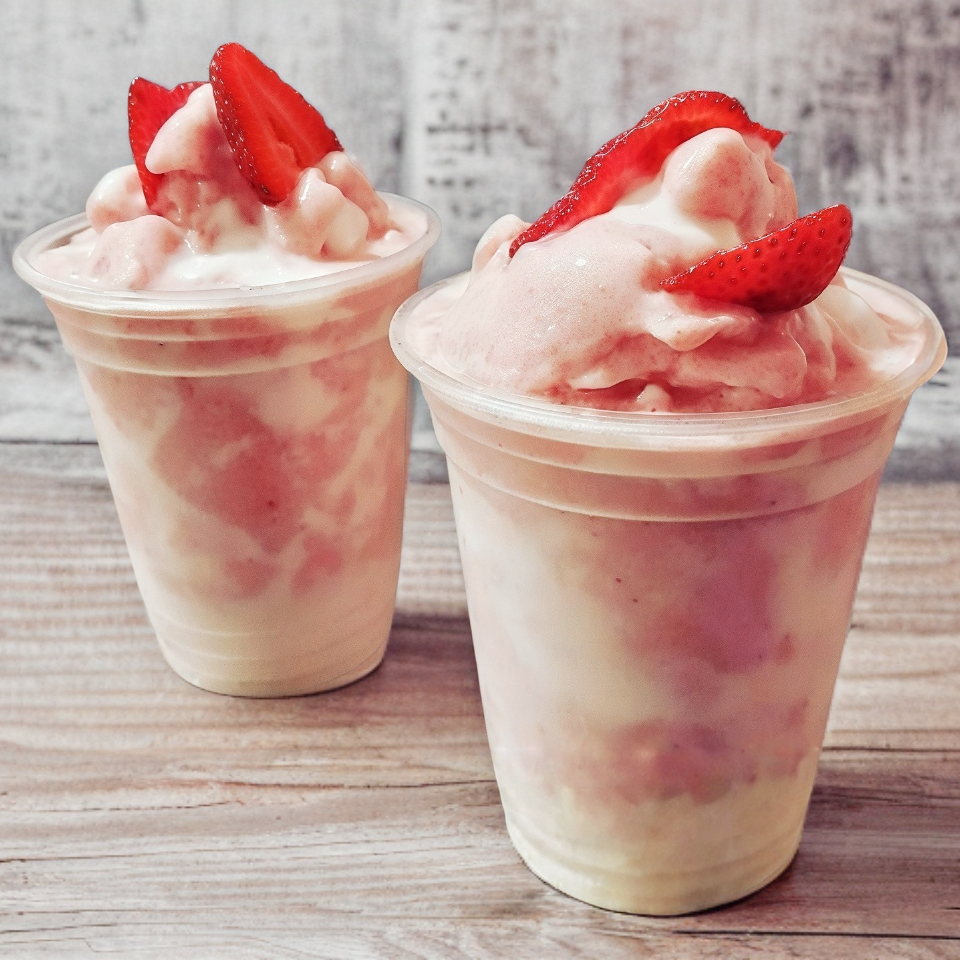 Deliciosa bebida elaborada con leche deslactosada, hielo, yogurt y fresas