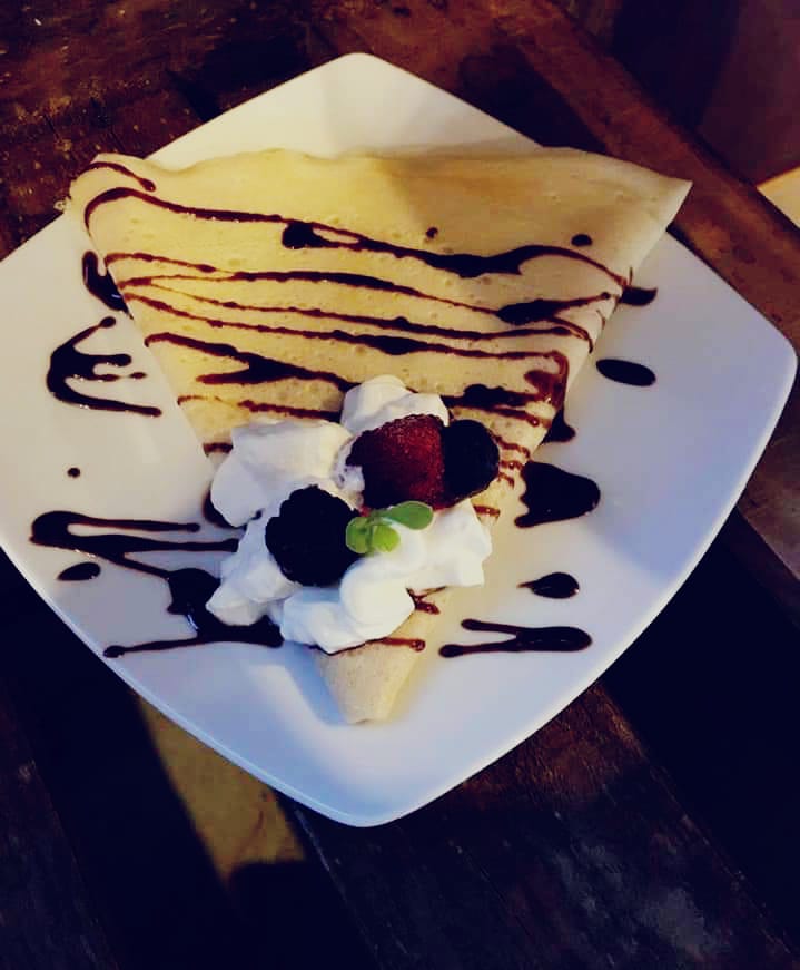 Deliciosa crepa elaborada a base de harina integral, rellena de milky way, Nutella, nuez y fresa