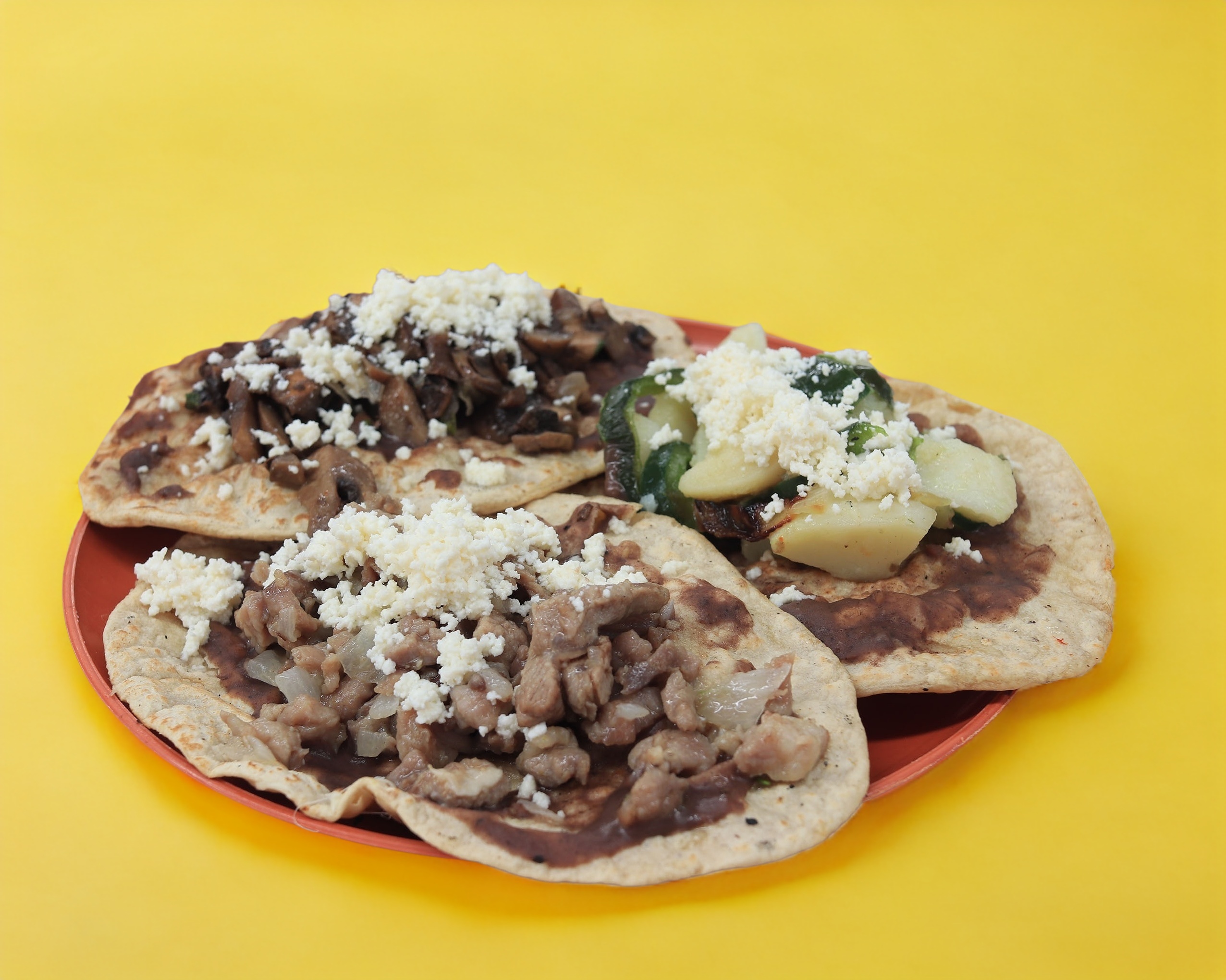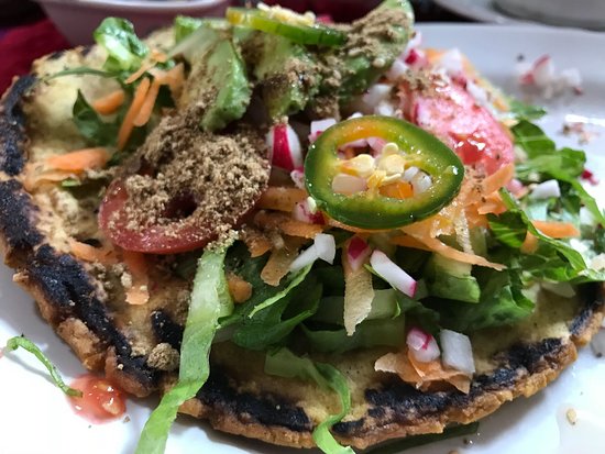 Tortilla de mano, pasta de frijol casera, productos sin carne ni lácteos.
