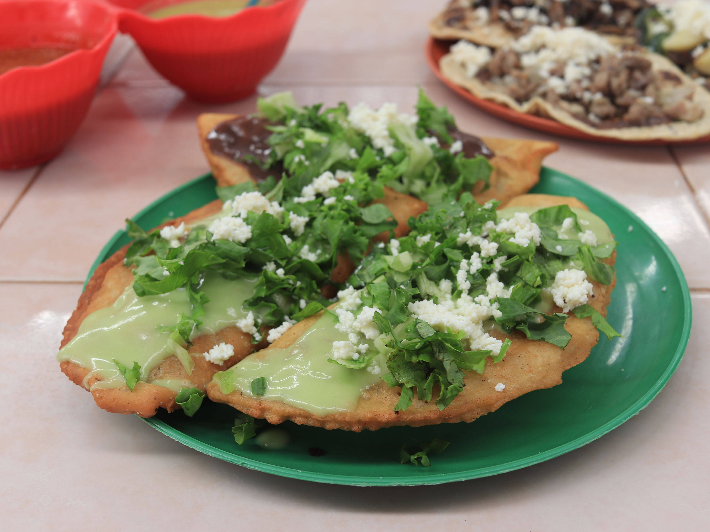 Memelita a mano, pasta de frijol y guisado vegano.