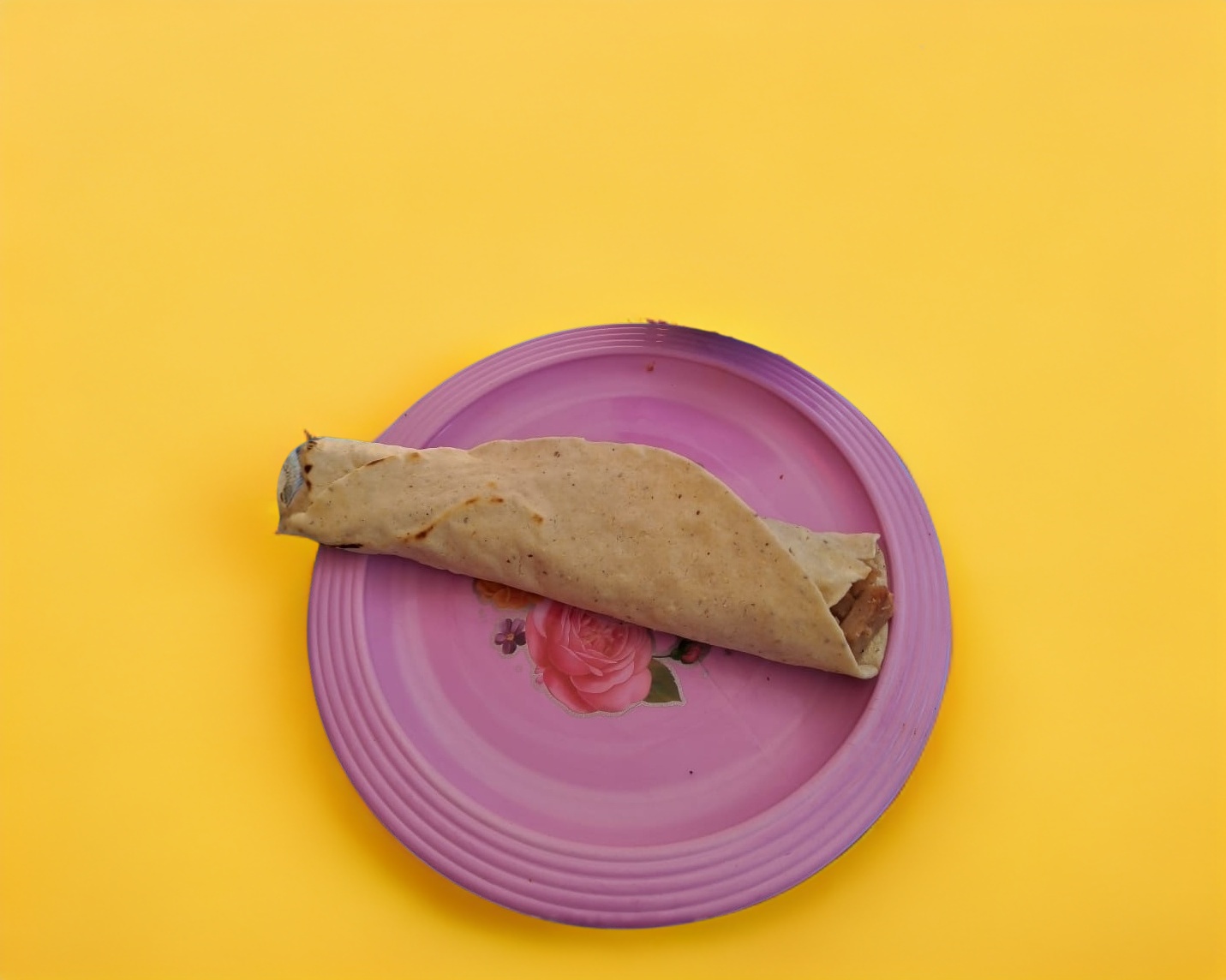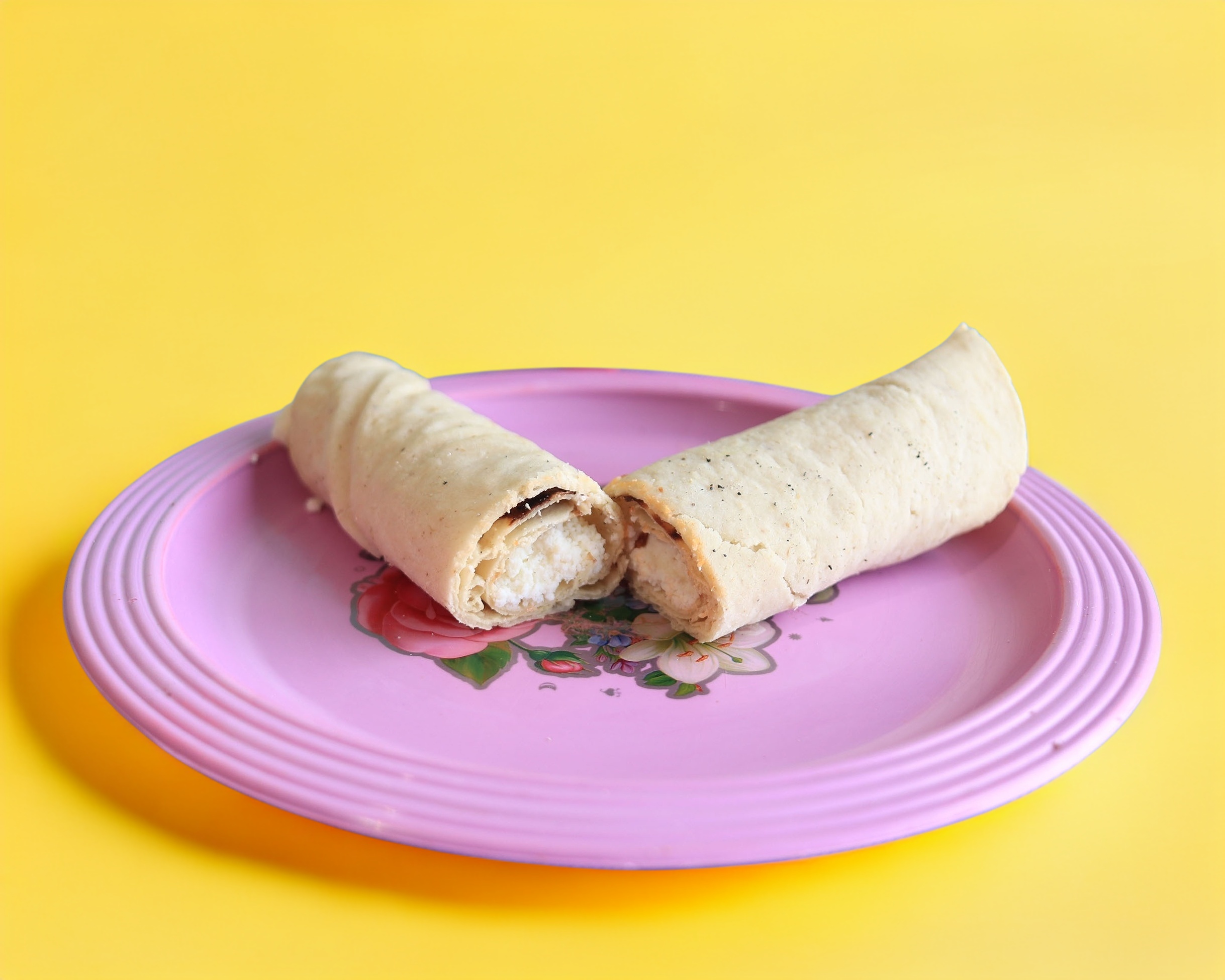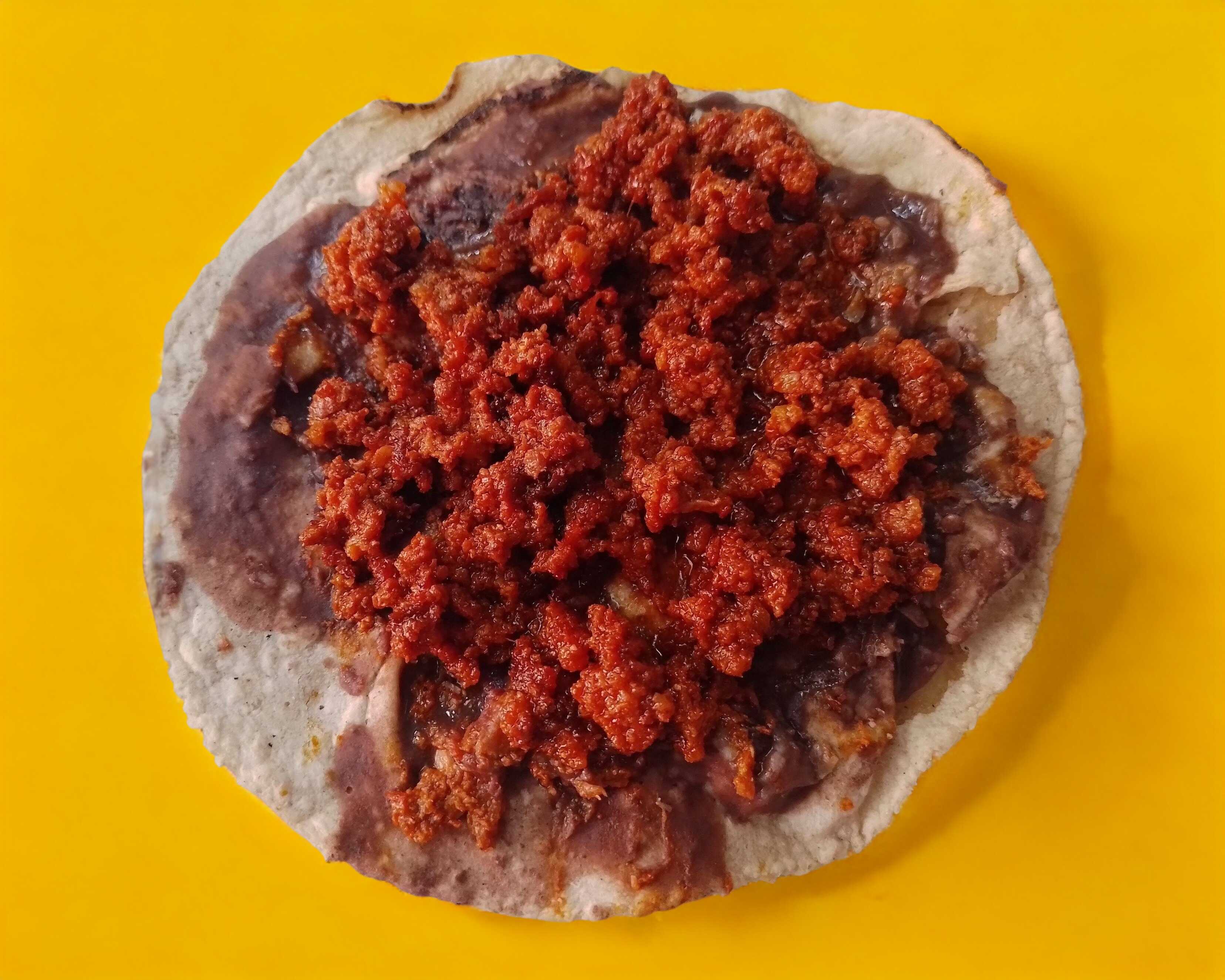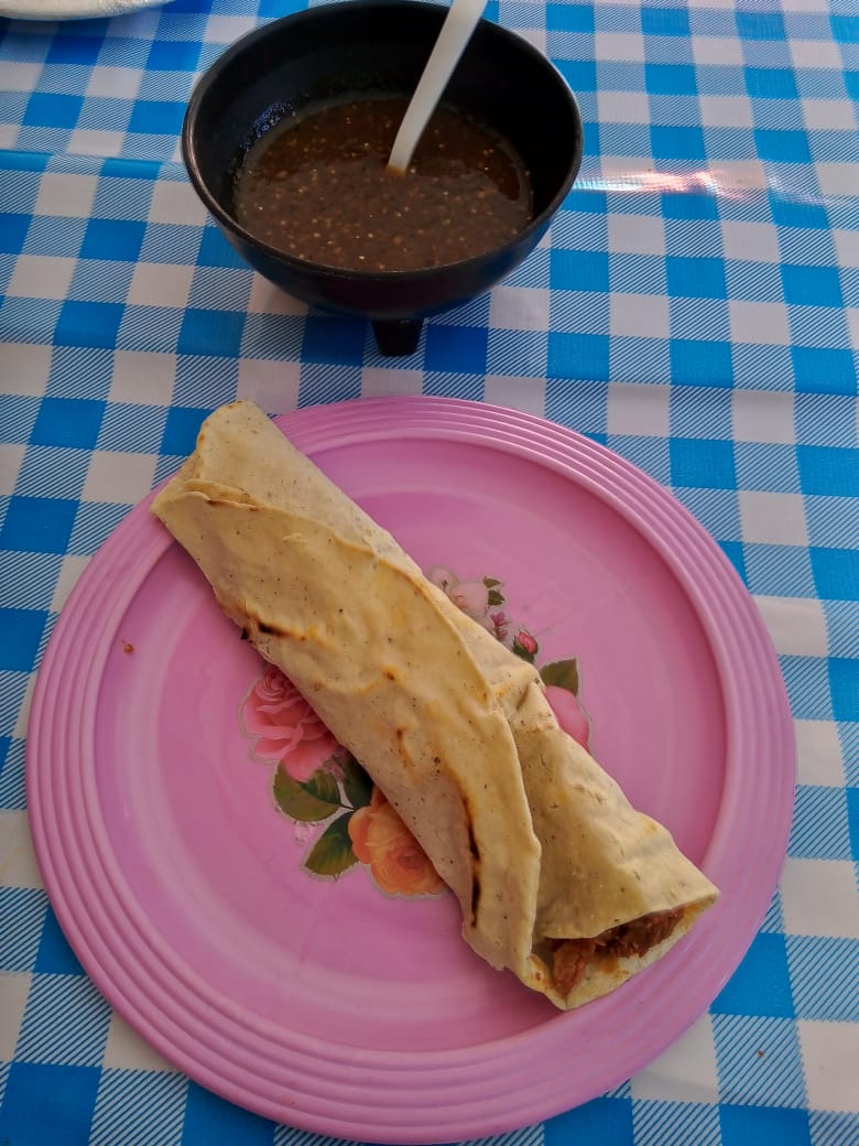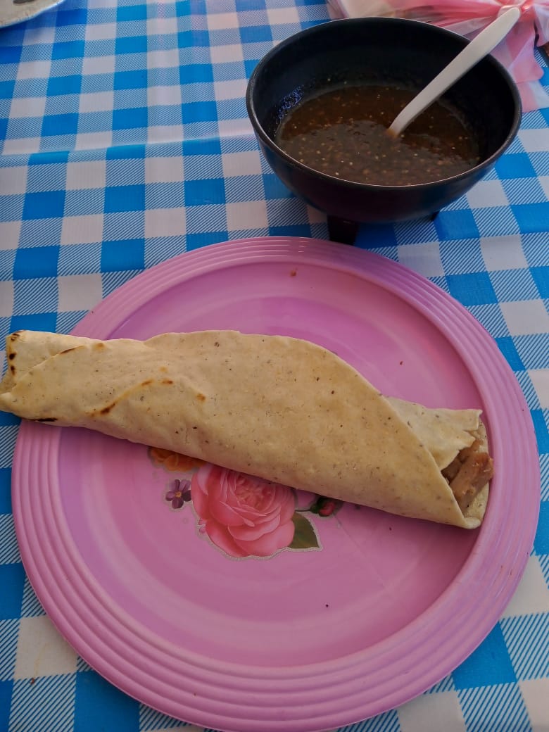 Tortilla alargada de 25 centímetros con frijol molido carne frita y quesillo acompañado de la salsa de la casa