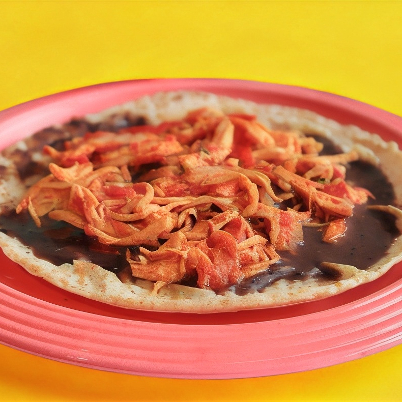 Tortilla grande alargada fríjol molido,tinga de pollo acompañado de la salsa de la casa