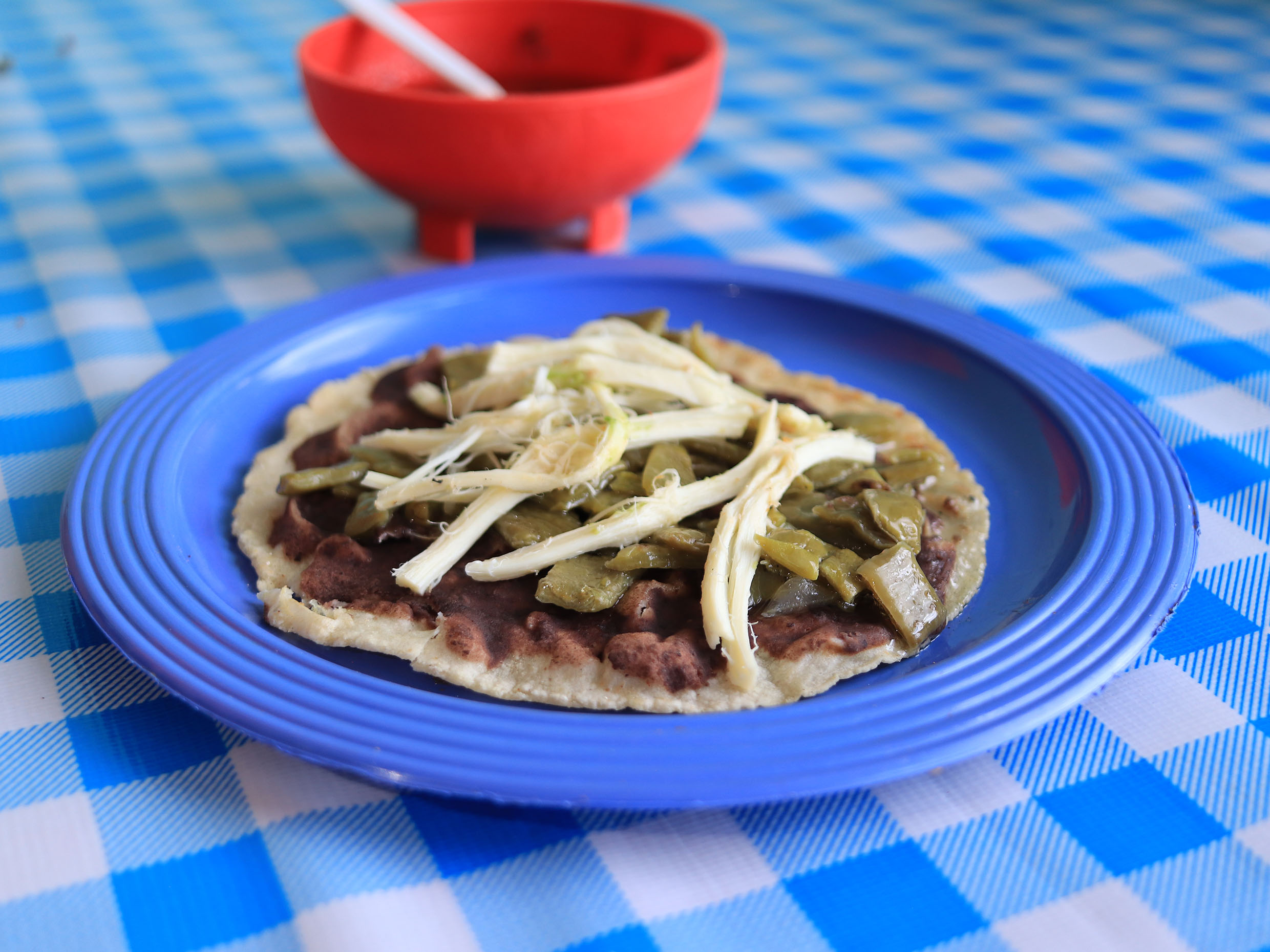 Tortilla de mano frijol nopales quesillo acompañado con salsas de la casa morita y habanero.