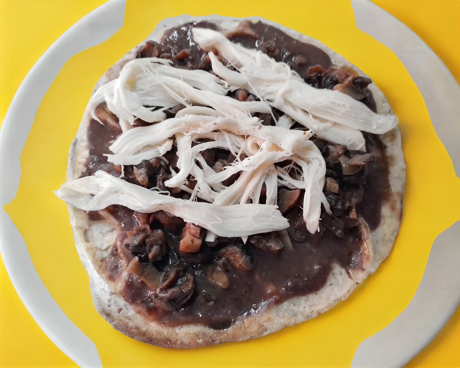 Tortilla de memela asiento frijol molido champiñones guisados con cebolla quesillo y salsas de la casa