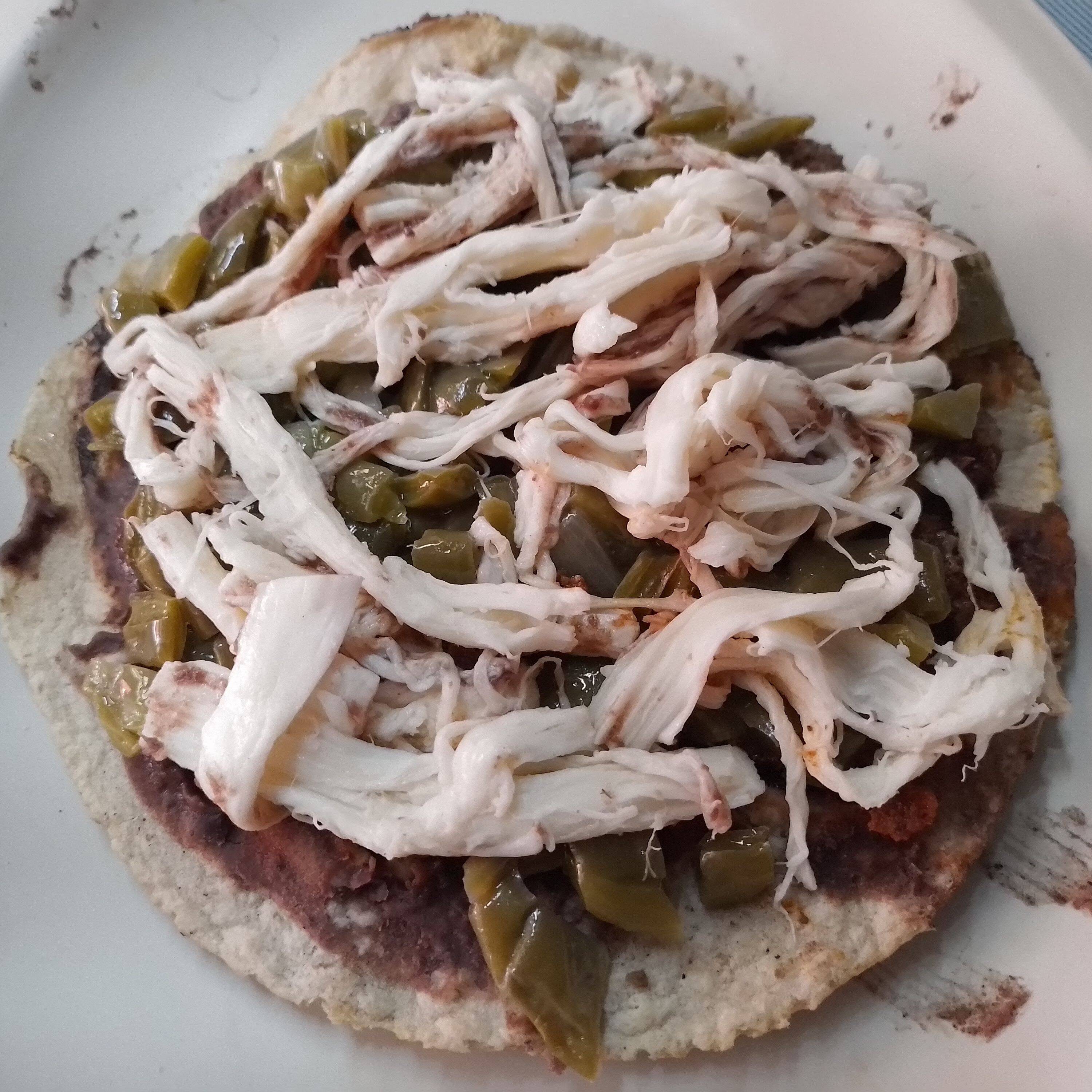 Tortilla de mano, frijol molido,Tinga de Pollo acompañado de la salsa de la casa