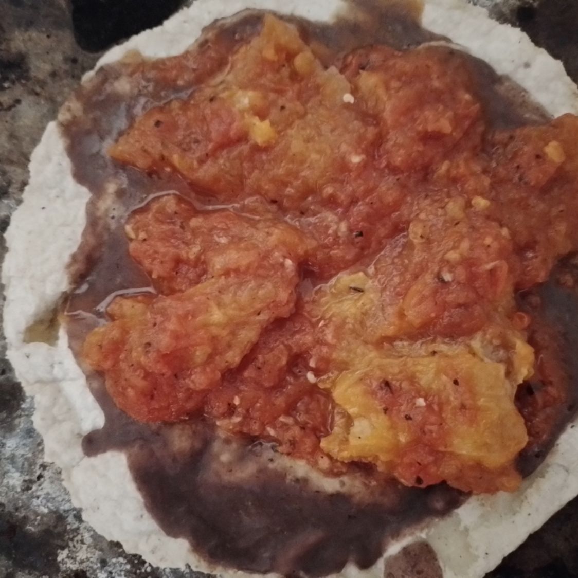 Tortilla alargada de 25 centímetros con frijol chorizo y quesillo acompañado con salsa de la casa