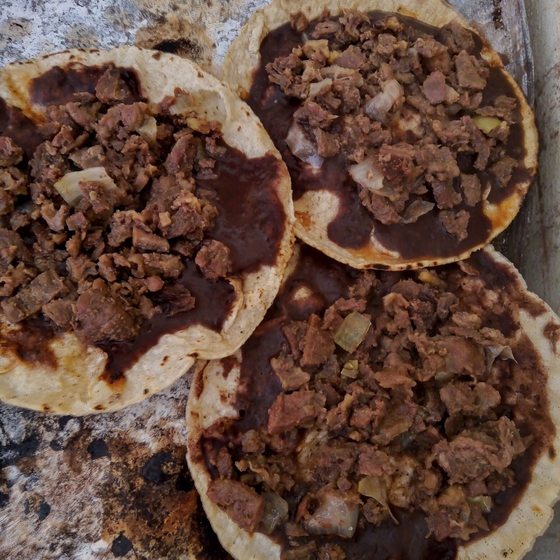 Tortilla de mano, frijol molido, carne frita, acompañado de la salsa de la casa