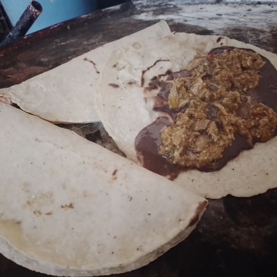 Tortilla grande, frijol molido salsa de costilla, quesillo acompañado de la salsa de la casa