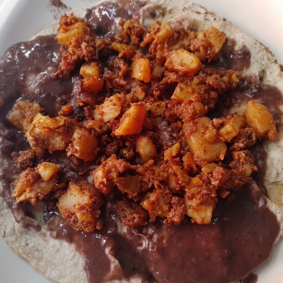 Tortilla de mano, frijol molido, papas con chorizo