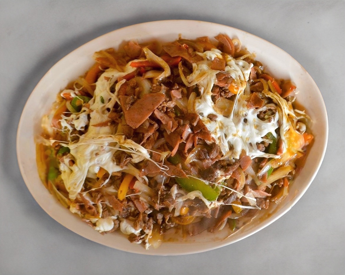 Tocino, pimiento morrón, cebolla, carne a elección todo gratinado con quesillo. ¡Delicioso!
