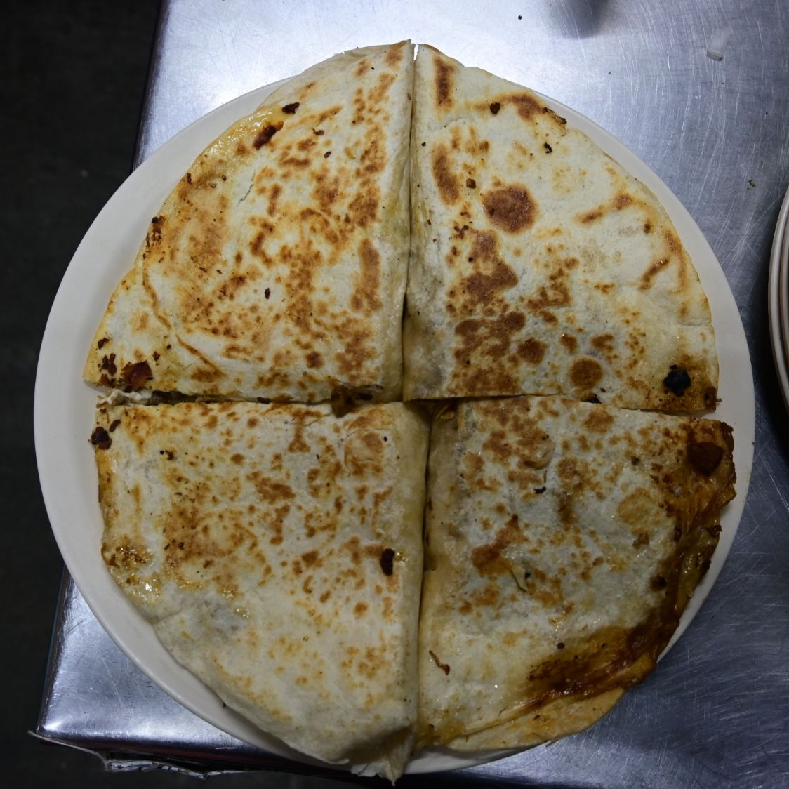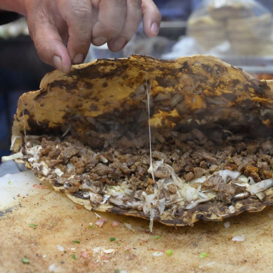 Tortilla de harina grande, quesillo y carne a elección, salsas roja, mexicana y guacamole. ¡Bien doraditas!