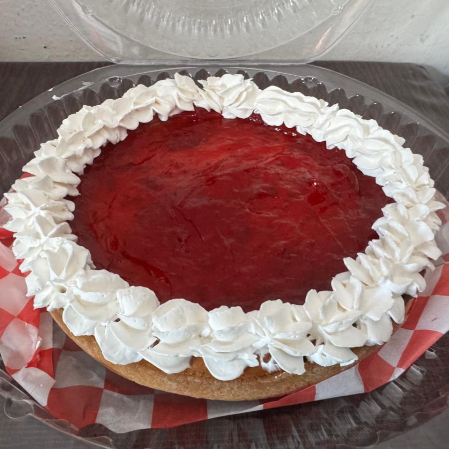 Pay de queso tradicional, con una deliciosa salsa de fresa y decorado con crema.