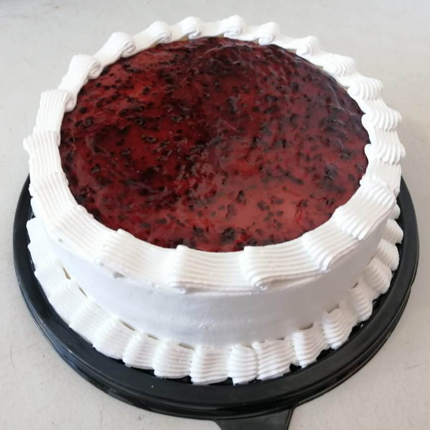Pan de vainilla bañado en tres leches, relleno de queso crema y zarzamora, cubierto de crema y salsa de zarzamora, (10 personas)