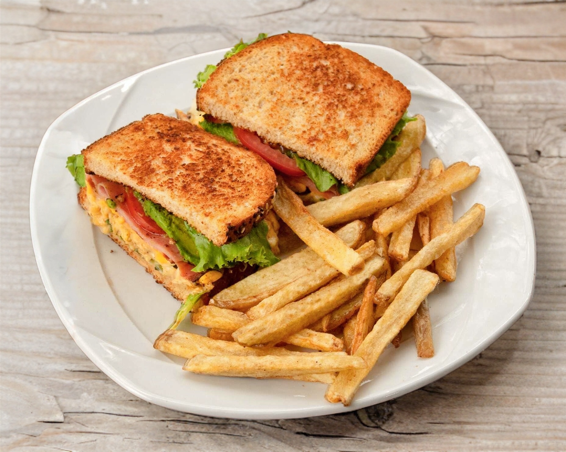 Pollo a la plancha, jamón, queso amarillo, queso manchego, lechuga, tomate, aguacate, aderezo de la casa y papas a la francesa.