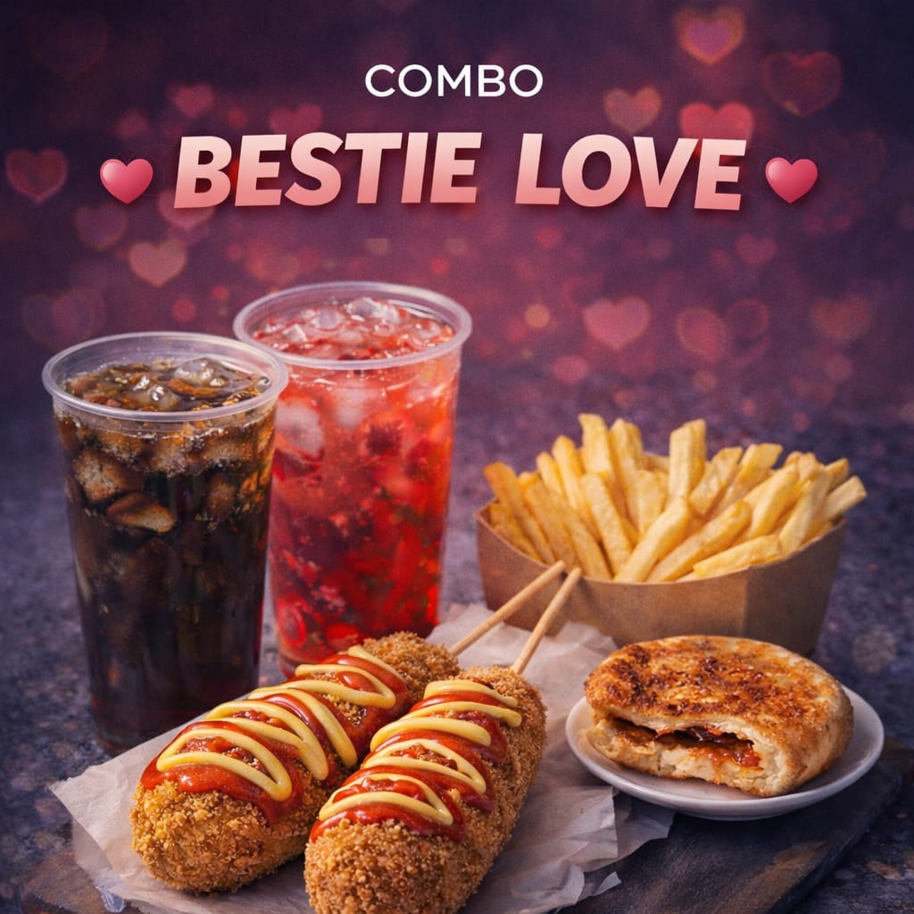 2 banderillas, 2 bebidas Dalgona, 1 Hotteok y 1 papas a la francesa ( las banderillas 1 rellena solo queso y la otra salchiqueso)