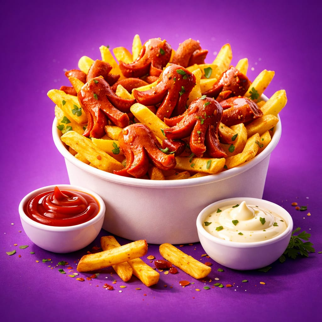 Trocitos de salchicha con papas a la francesa.