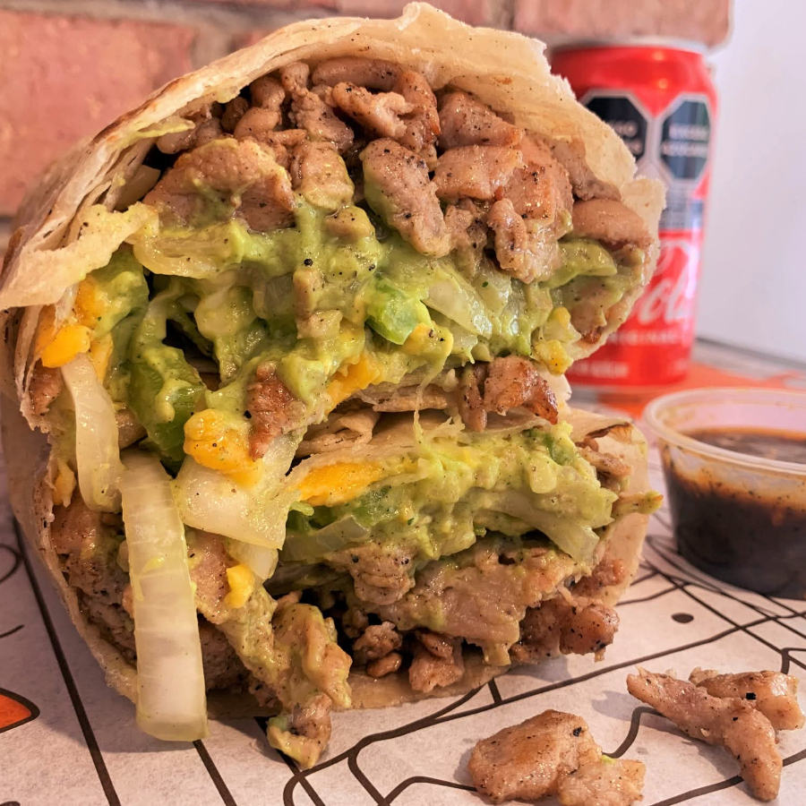 Tortilla de harina XXL 15 CM Mezcla de Quesos, Costilla Adobada, Lechuga, Arroz, Pico de Gallo, Frijoles Refritos, agrega tu bebida: