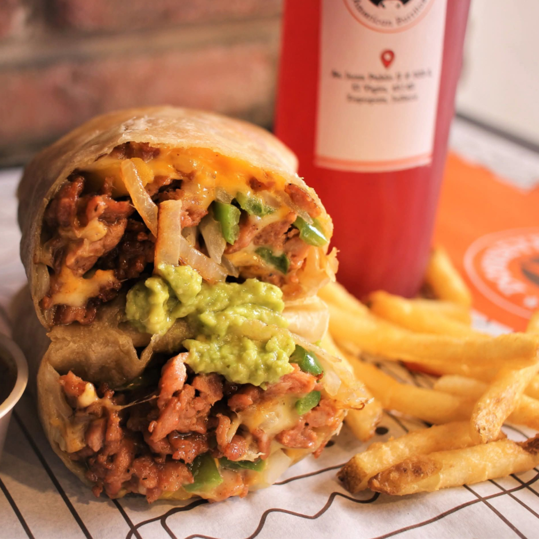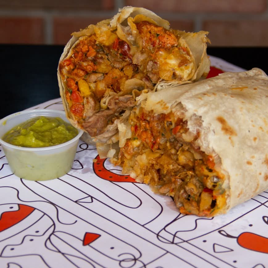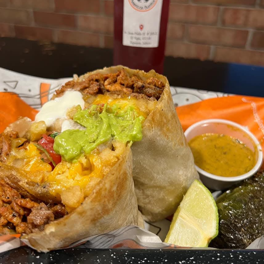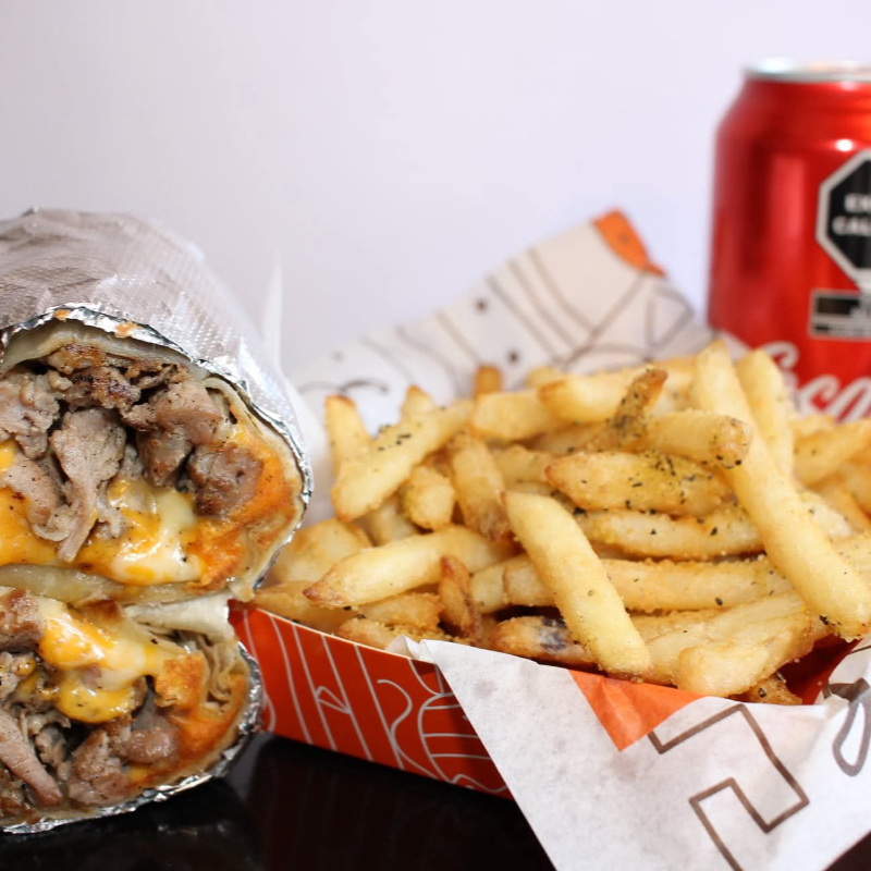 Tortilla de harina XXL 15 CM relleno con Mezcla de Quesos, chipotle, carne en rodajas, arroz rojo, frijol refritos, lechuga, Incluye papas a la francesa, agrega tu bebida: