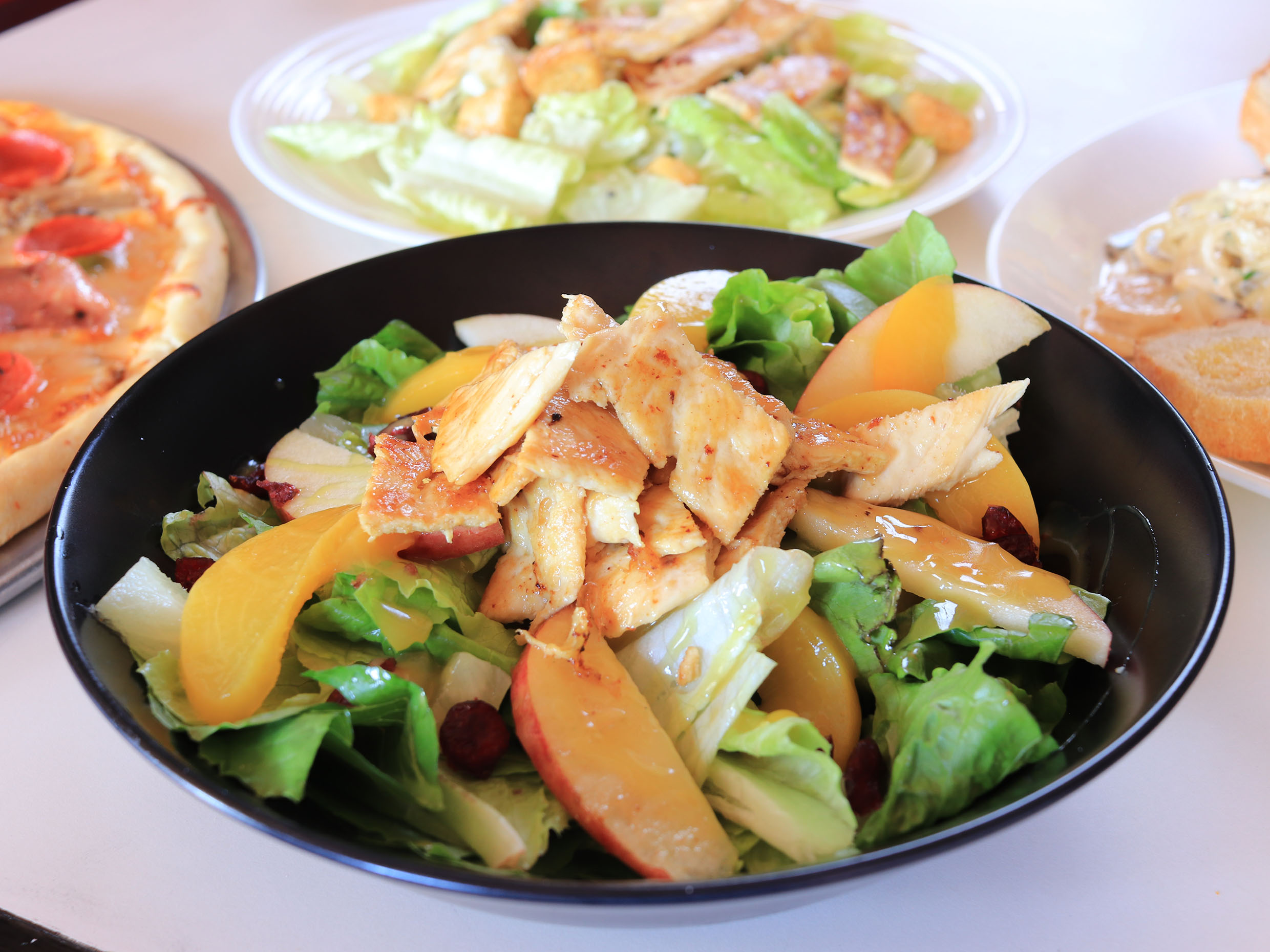 Lechuga mixta, trozos de piña, durazno, manzana, arándanos y trozos de pollo a la plancha, con el aderezo de tu elección.
