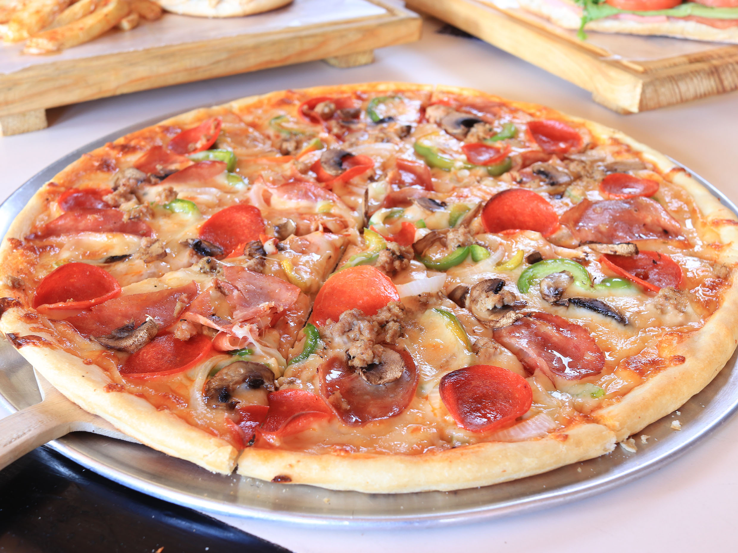 Pizza grande de 8 rebanadas con carne molida, pepperoni, salami, champiñones, pimiento verde y cebolla.