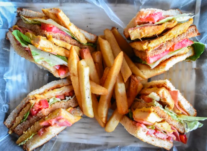 Sándwich de tres pisos con pechuga de pollo a la plancha, jamón, tocino, queso gouda gratinado, tomate y lechuga