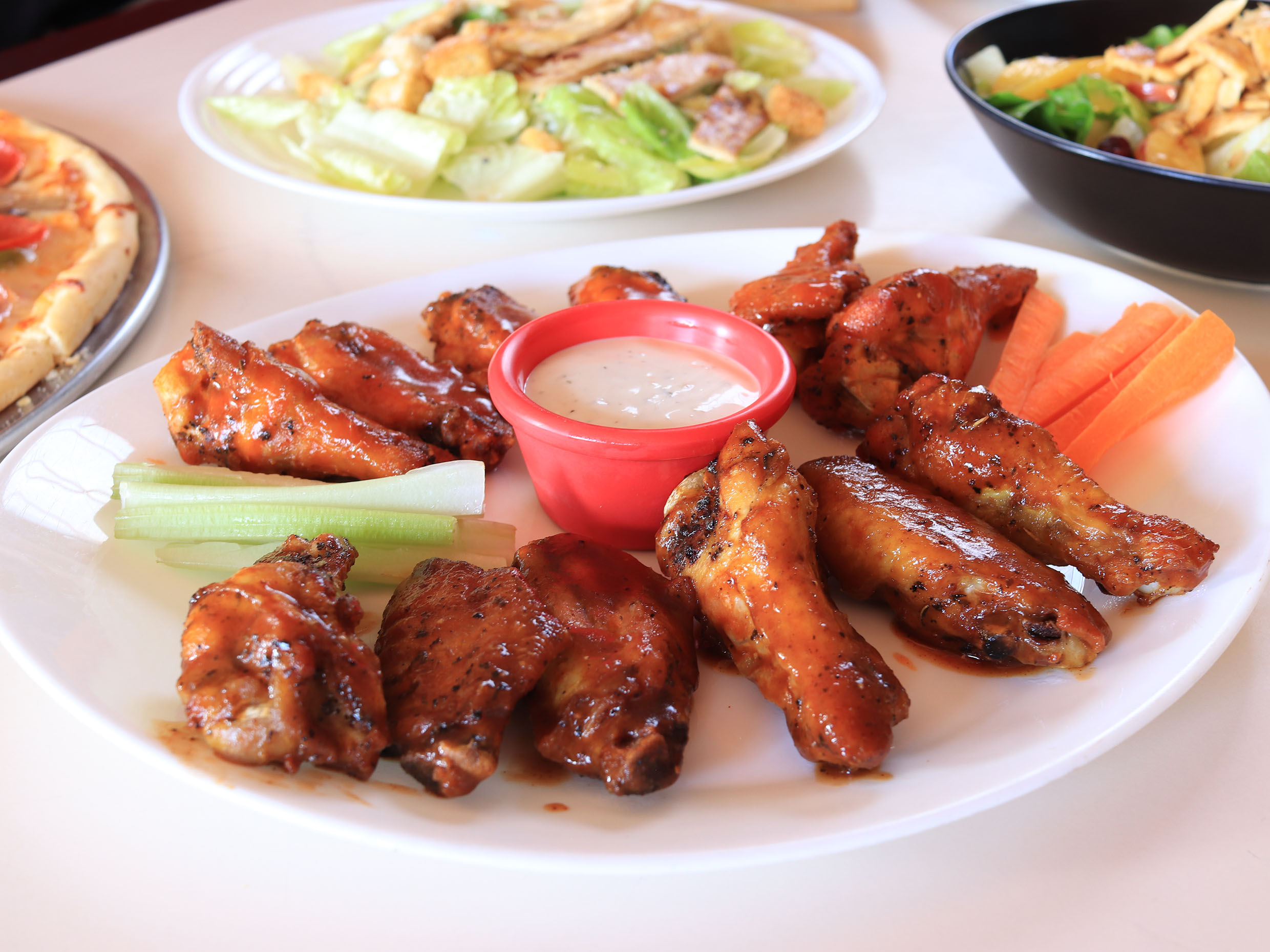 Capeado de la casa, con aderezo ranch y bastones de zanahoria y apio
